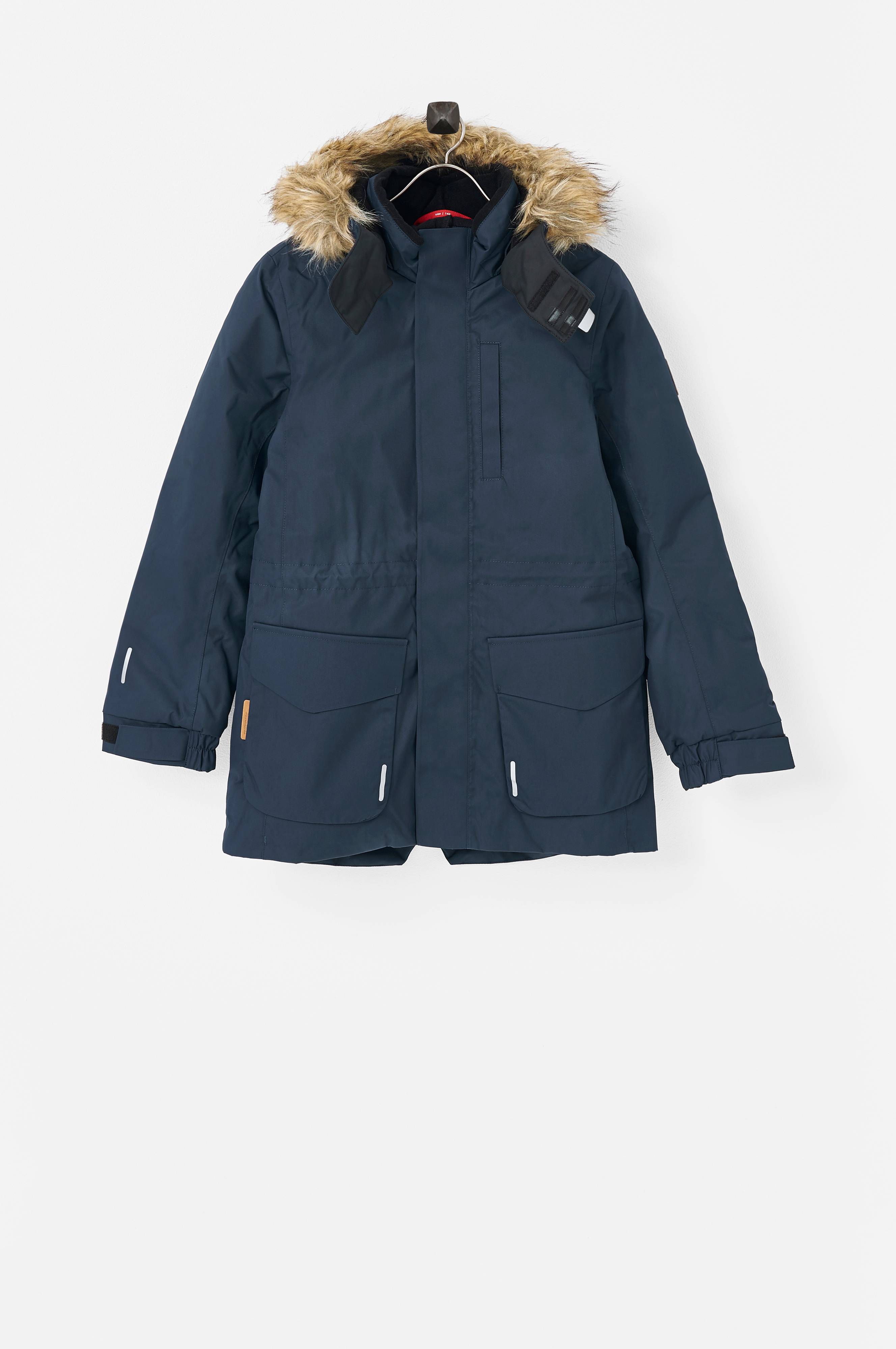 Irrotettava, säädettävä huppu, jossa fleecevuori, irrotettava tekoturkisreunus ja edessä tarrasuljenta. Korkea kaulus, jossa sisäpuolella fleecevuori. Vetoketju, leukasuoja, tuulisuojalista ja tarrasuljenta. Nyöri ja stopperit vyötärön sisäpuolella. Alhaalla kaksi isoa taskua, joissa kansi ja tarrasuljenta. Rintatasku. Vetoketjullinen sisätasku koosta 116 ylöspäin. Upotettu kuminauha ja tarranauha hihansuissa, joissa sisäpuolella pehmeää fleeceä. Pyöristetty, takaa hieman pidempi helma, jossa halkio. Heijastavat yksityiskohdat edessä ja takana. Voidaan kuivata kuivausrummussa.