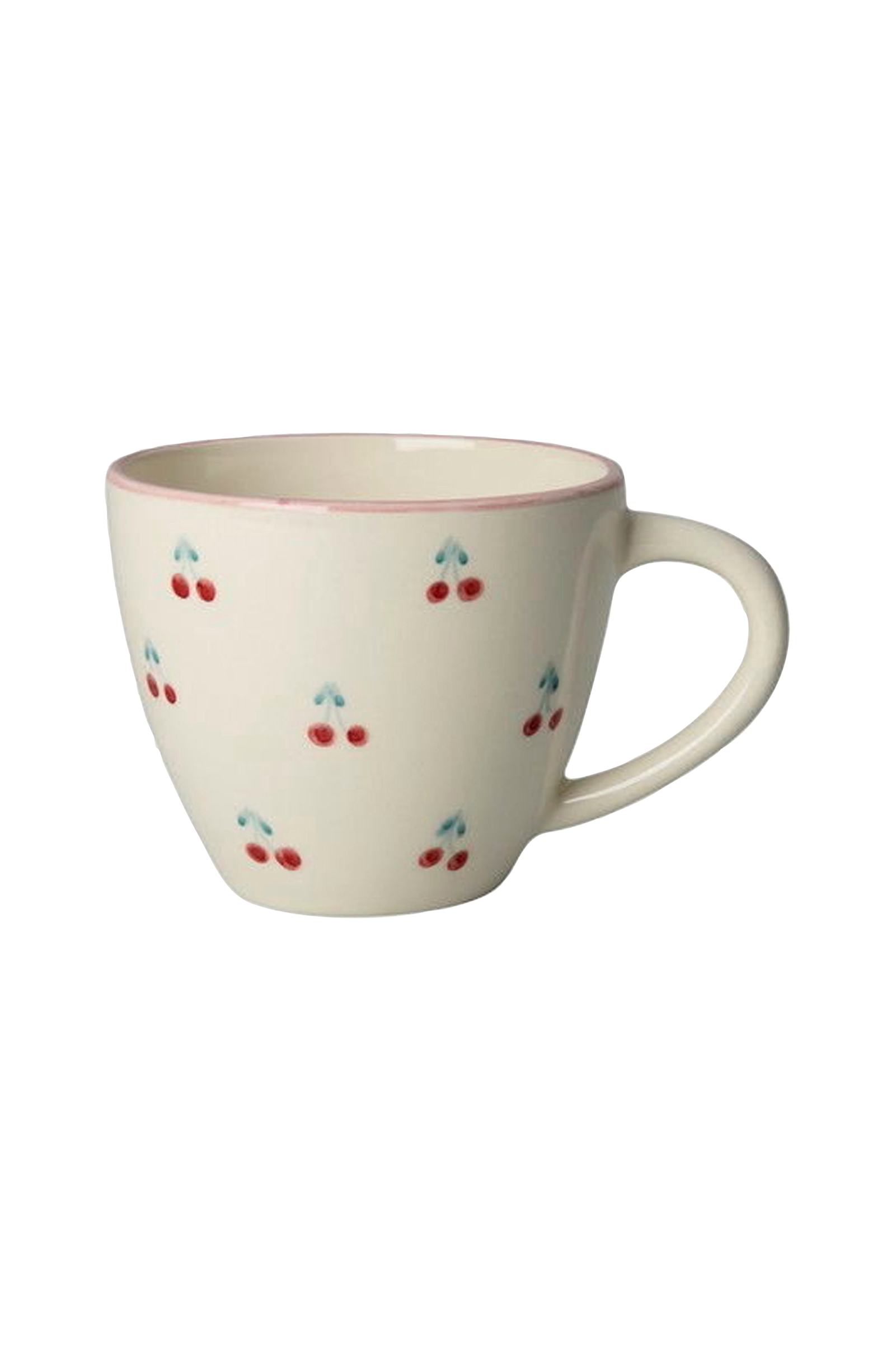 Suloisin keraaminen kahvimuki, jossa on käsinmaalattuja kirsikoita ja reunus. Ryhmä upeita portugalilaisia naisia on maalannut mukin käsin, mikä tekee jokaisesta mukista täysin ainutlaatuisen. Meidän mielestämme se on niin viehättävä! Mahdollisten rengasjälkien tai puupöytien vaurioitumisen välttämiseksi suosittelemme käyttämään aluslevyä, kun laitat kuumia juomia keraamisiin kuppeihin tai mukeihin. Kuumuus voi joskus aiheuttaa kosteuden tunkeutumista pintaan, mikä voi ajan myötä jättää jälkiä. Suojaa huonekalusi tällä yksinkertaisella toimenpiteellä!