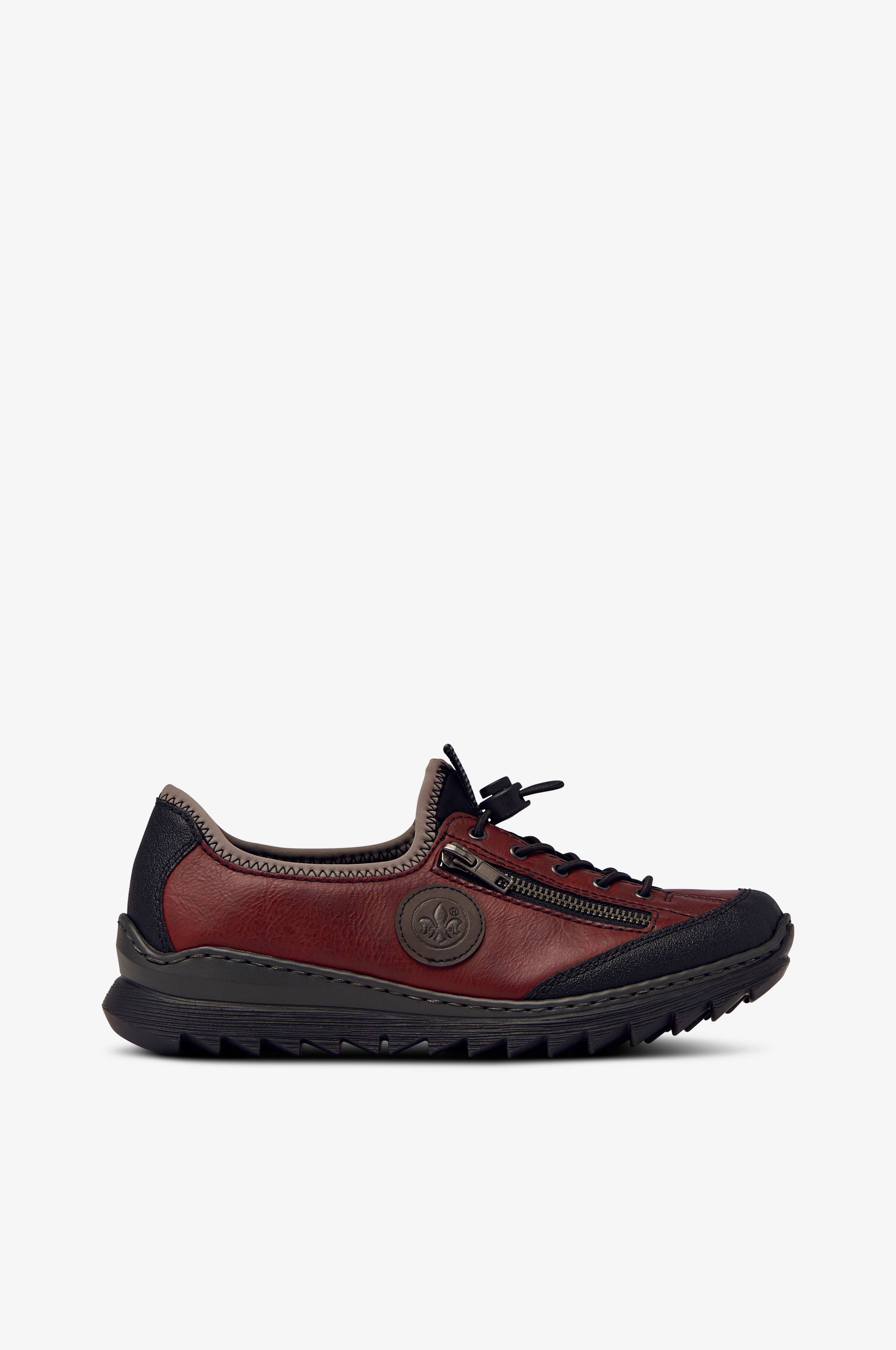Rieker-kävelykengät pehmeää nahkajäljitelmää. Mukava, sukkamainen rakenne ja pehmeä MemoSoft antistress -sisäpohja, joka muovautuu jalan mukaan ja vähentää jalkojen väsymistä. Joustava pikanyöritys ja stopperi. Koristevetoketju ulkosivulla. Kestävä ulkopohja, jossa aaltomainen kuvio.