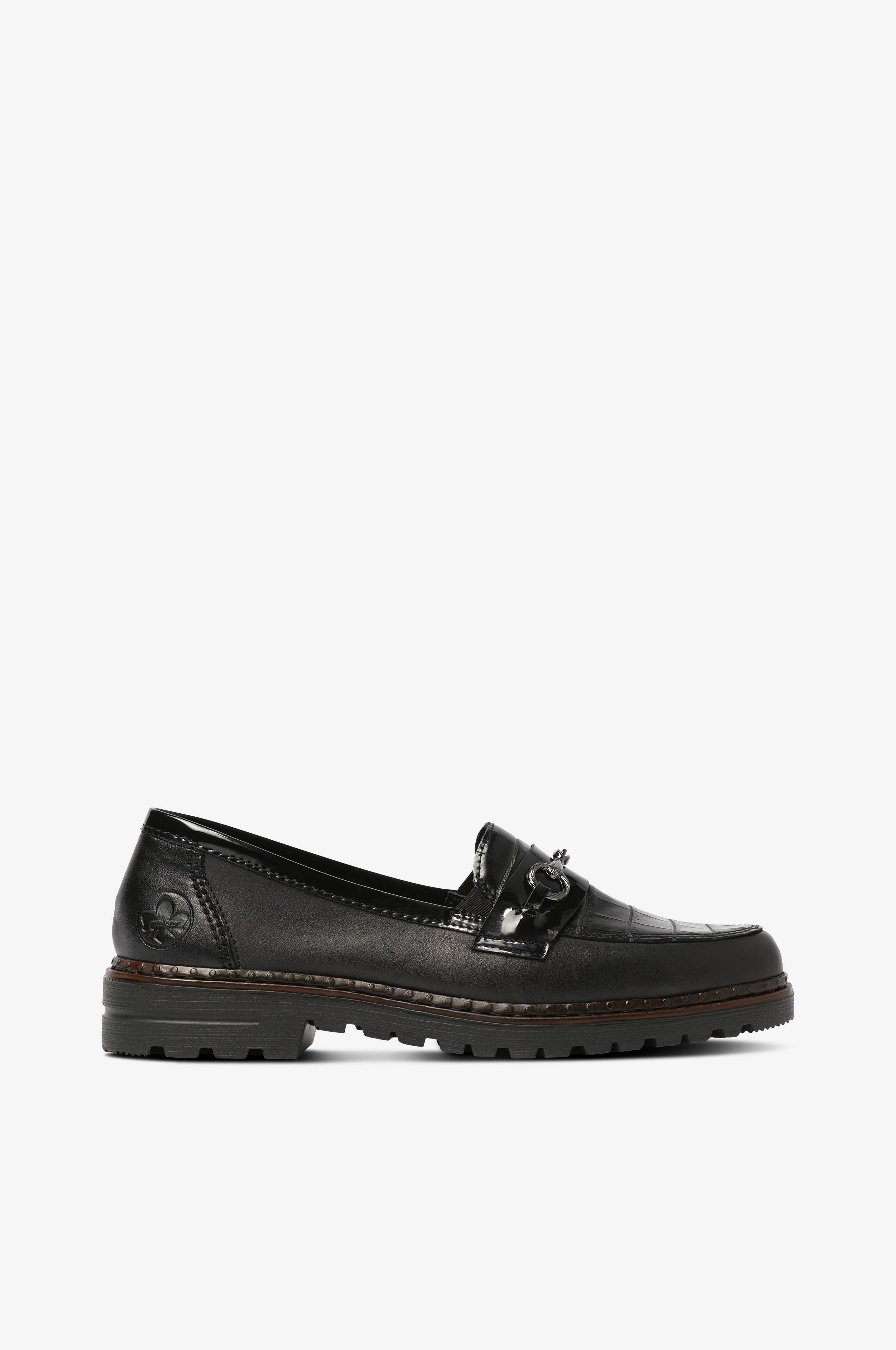 Klassiset nahkaloaferit, joissa nahkajäljitelmäosioita. Jalan päällä lakattu remmi, jossa metalliyksityiskohta. Pehmustettu antistress-sisäpohja, joka muotoutuu jalan mukaan ja antaa miellyttävän vaimennuksen. Karkeakuvioinen pohja ja korko.