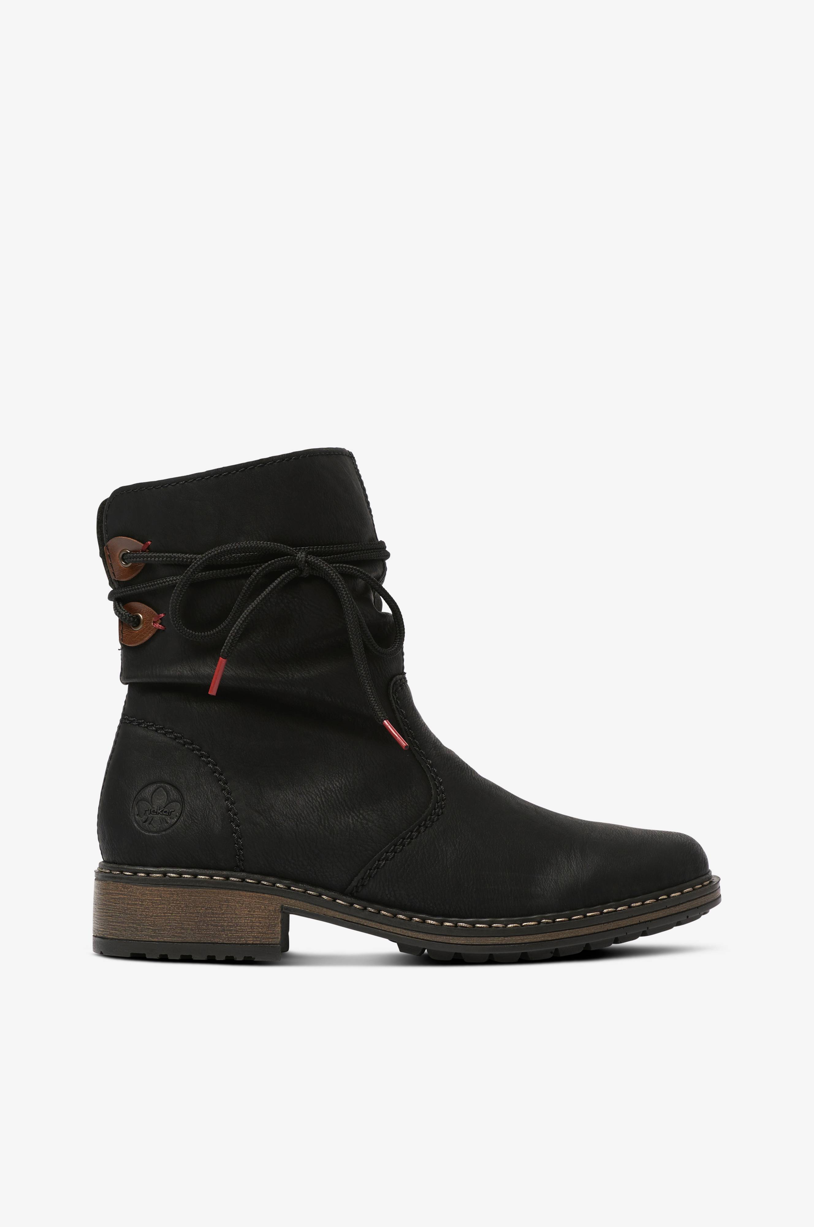 Nilkkurit nahkajäljitelmää. Pehmeä, lämmin fleecevuori. Laskostettu varsi, jossa halkio takana ja solmimisnauhat ympäriinsä. Vetoketju varren sisäsivulla. Varren korkeus n. 16 cm, koron korkeus n. 3,5 cm.