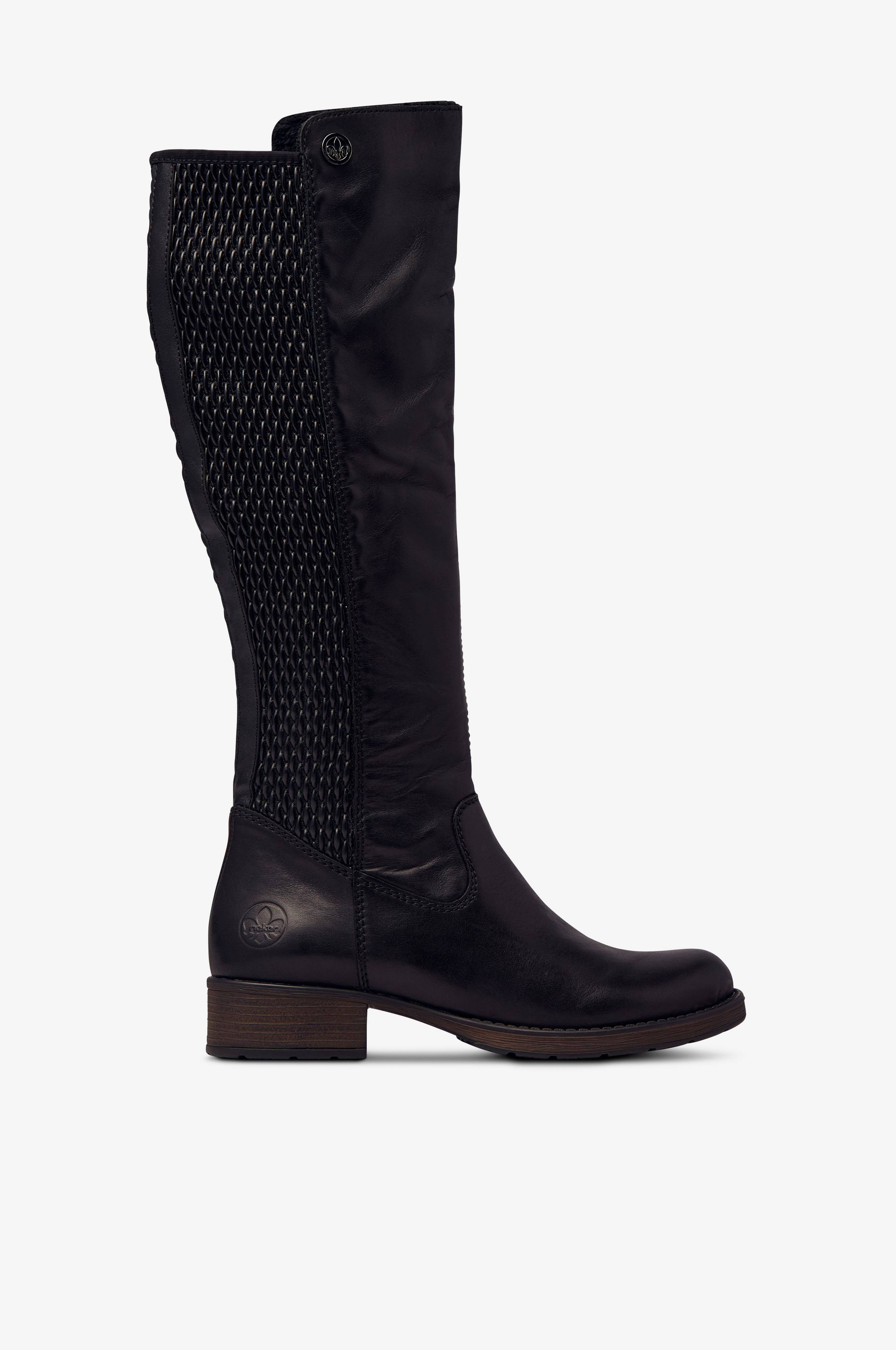 Korkeat Rieker-saappaat nahkaa. Kuviopintaiset venykepaneelit sivuilla ja vetoketju sisäsivulla. Mukava antistress-sisäpohja muotoutuu jalan mukaan ja ehkäisee jalkojen väsymistä. Pehmeä vuori. Varren korkeus n. 38,5 cm.