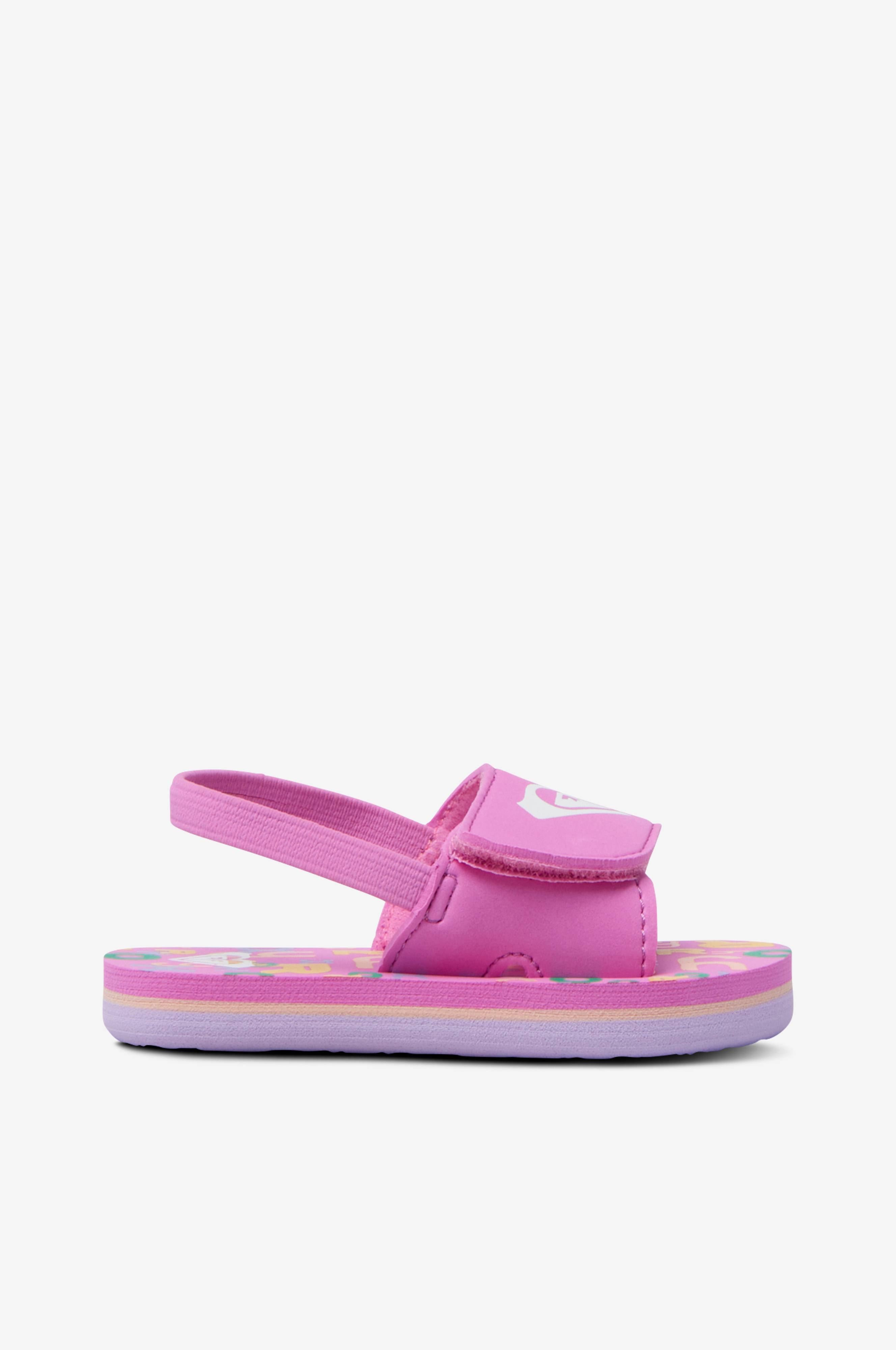 Roxy Finn -varvassandaalit, joissa pehmeä päällinen synteettistä materiaalia ja kangasvuori. Tarranauhakiinnitys istuvuuden säätämistä varten. Joustava kantaremmi. Pehmeä kimmoisa pohja.