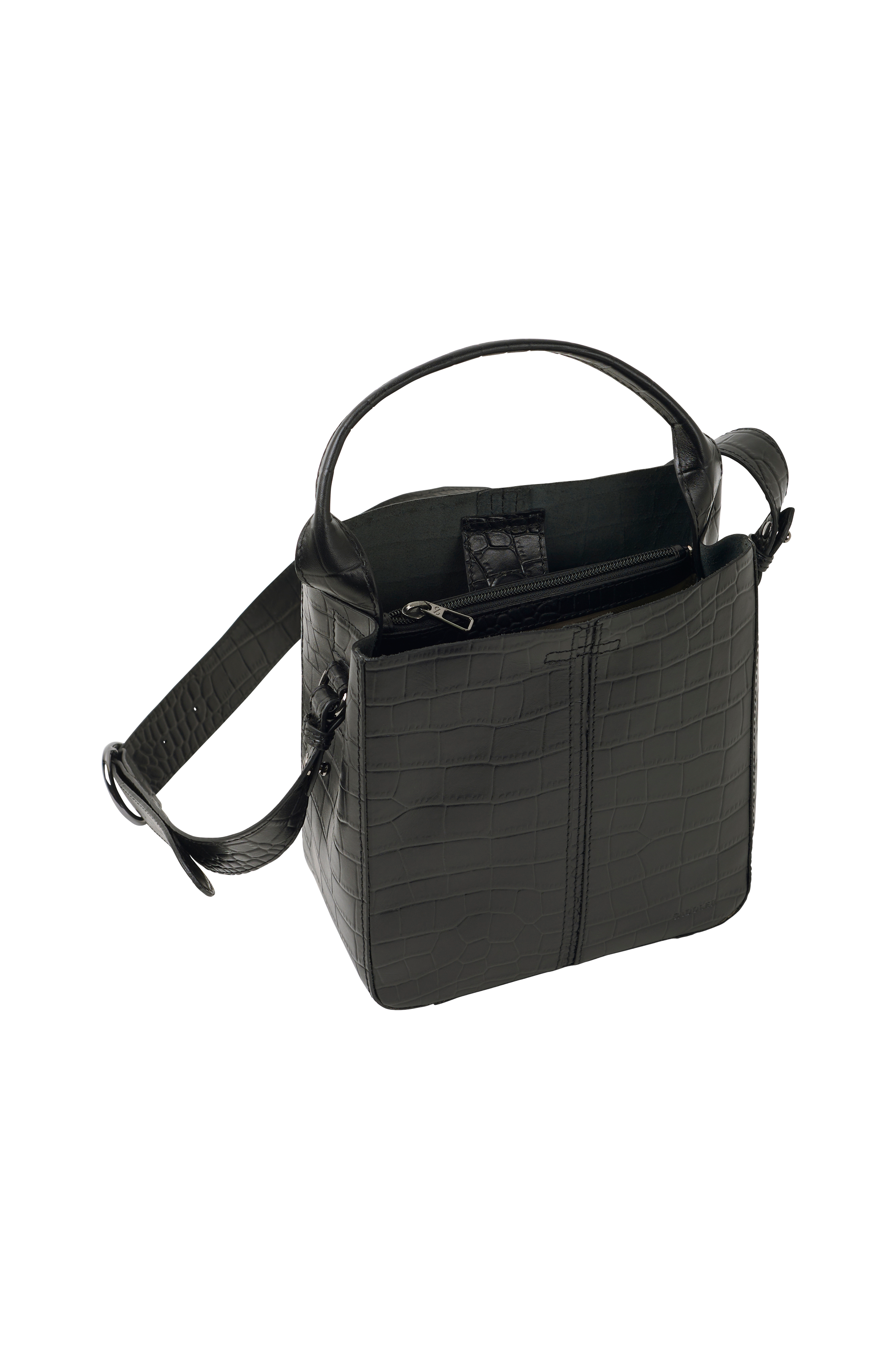 Olkalaukku puhvelinnahkaa. Suljetaan magneettinapilla. Sisällä kaksi avolokeroa, vetoketjutasku ja pieni avotasku. Kantokahva ja säädettävä, irrotettava olkahihna. Mitat: L 20 x K 22 x S 10 cm.