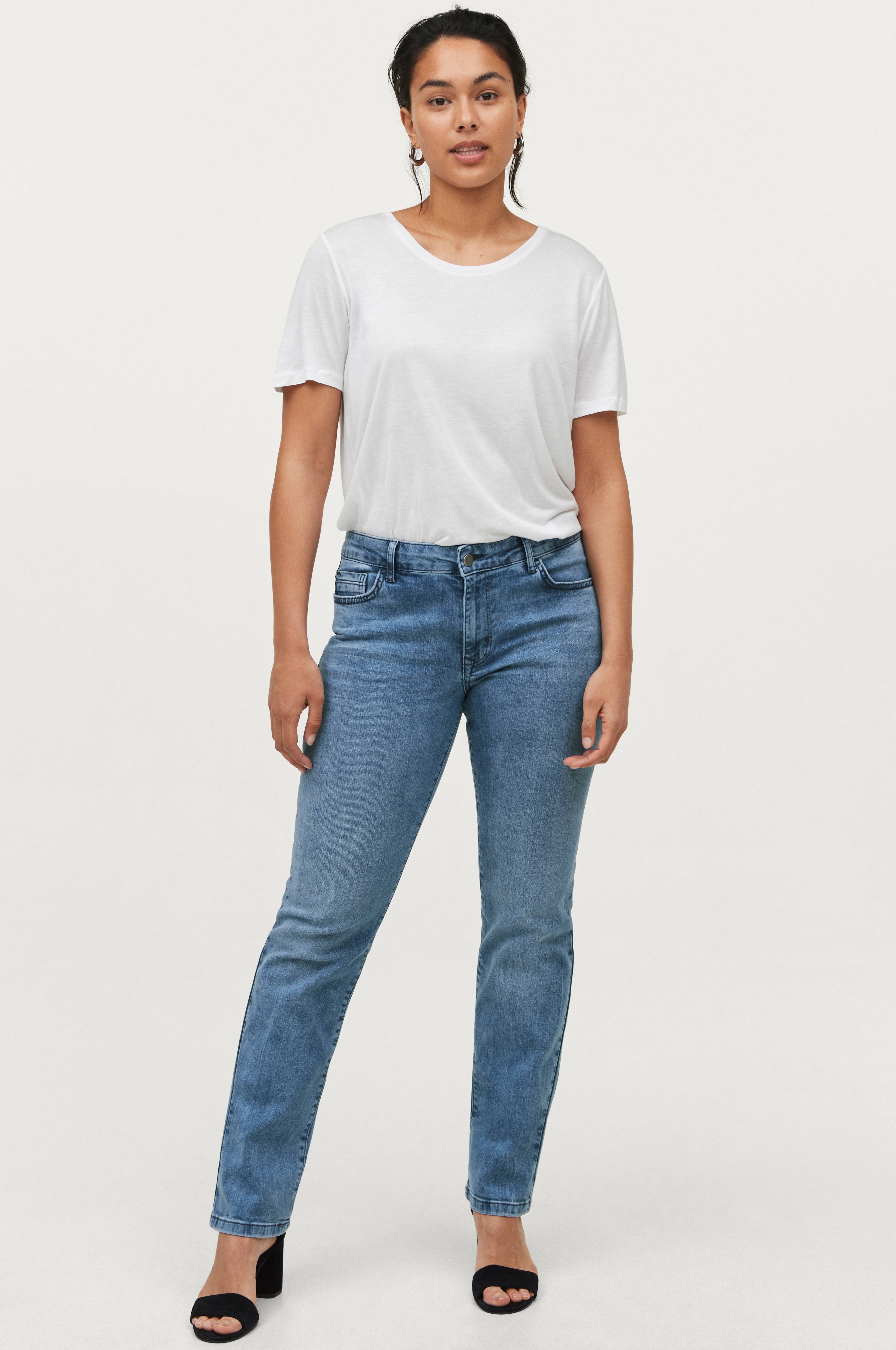 Malli on 177 cm pitkä ja hänellä on päällään koko W30