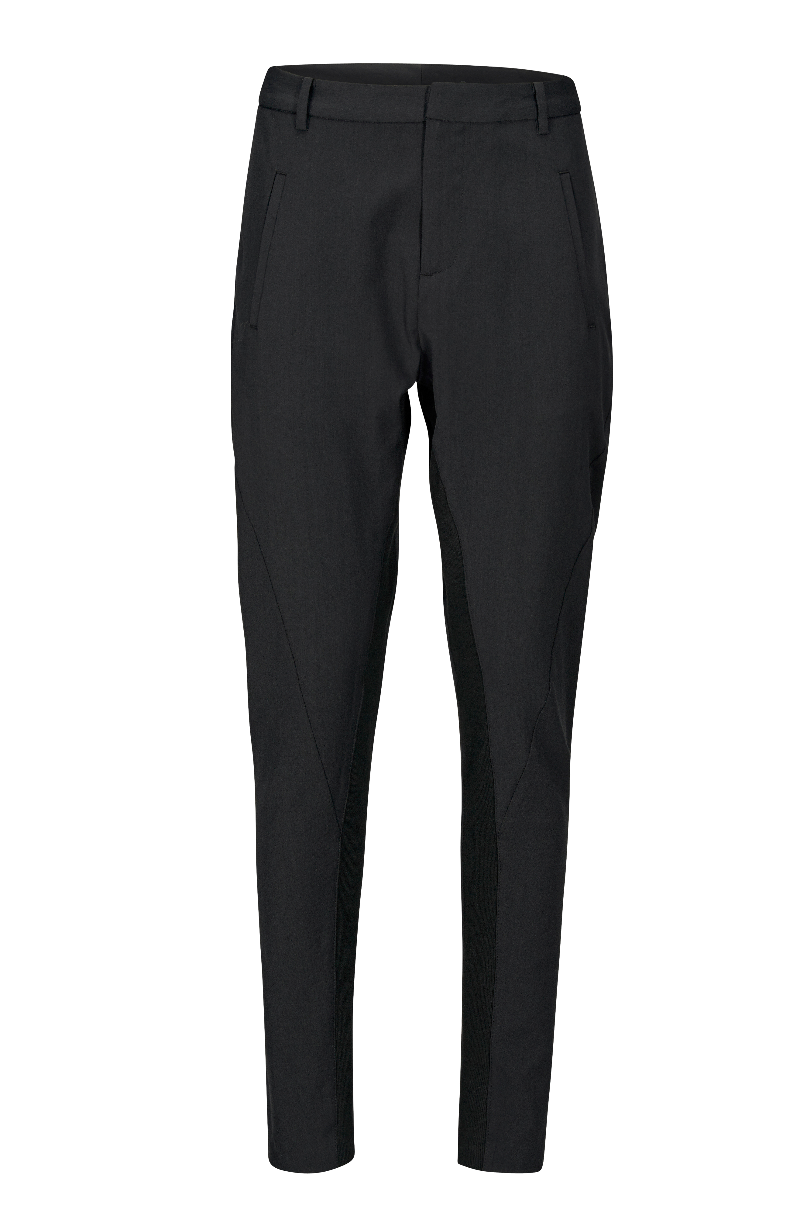 Saint Tropez -housut, joissa elegantti malli ja tyylikäs joustinneulostrikoopaneeli lahkeiden sisäsivulla. Väljä istuvuus ja hieman kapenevat lahkeensuut. Viisto koristesauma edessä toisessa lahkeessa, sivutaskut ja yksi valetakatasku. Etuhalkiossa vetoketju, nappi ja hakanen. Lahkeen sisäpituus 76 cm.
