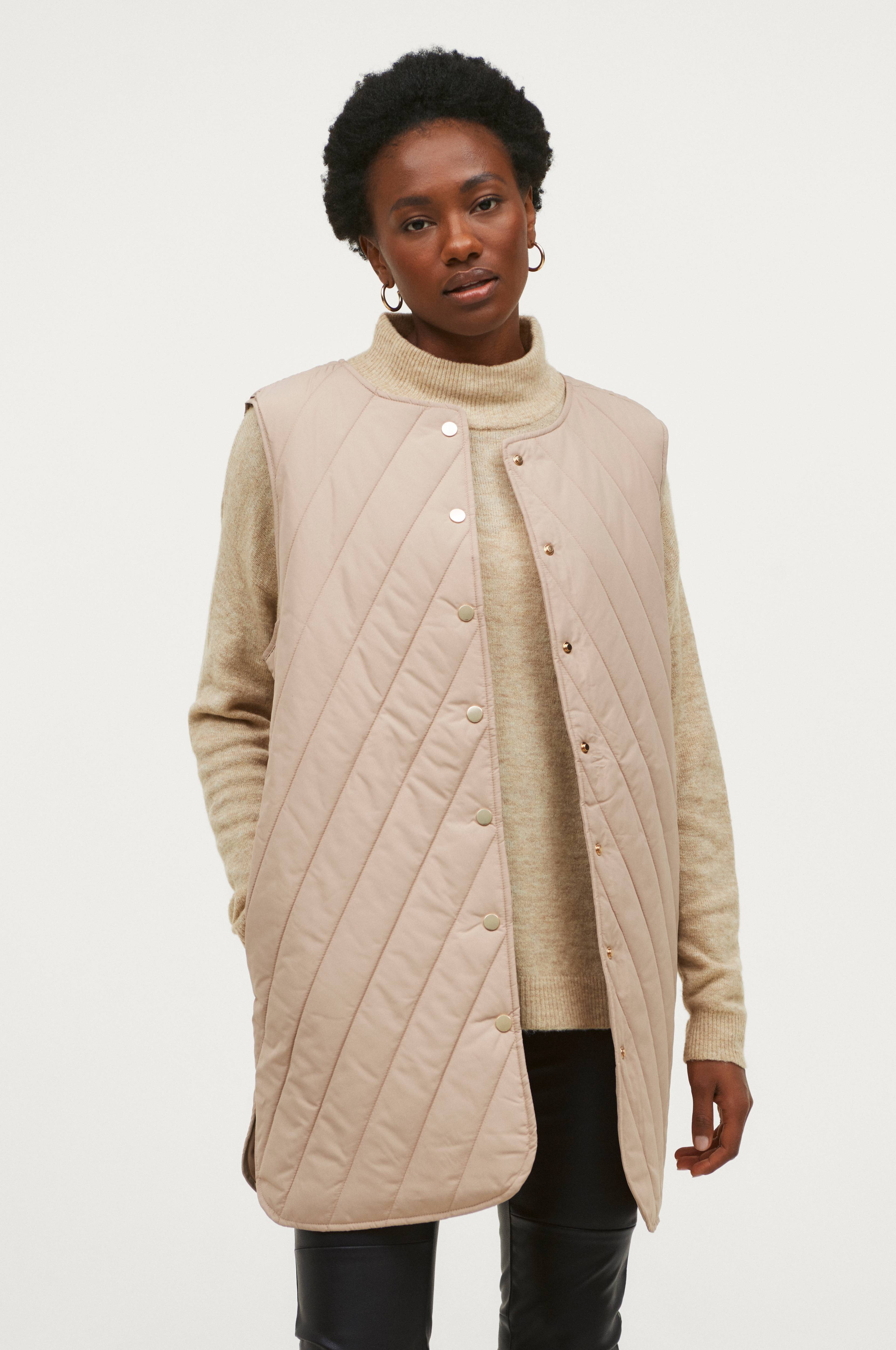 Kevyesti topattu pitkä liivi, jossa tikkaus. Painonapit edessä ja upotetut sivutaskut. Pyöristetyt sivuhalkiot helmassa. Pituus n. 85 cm koossa S.