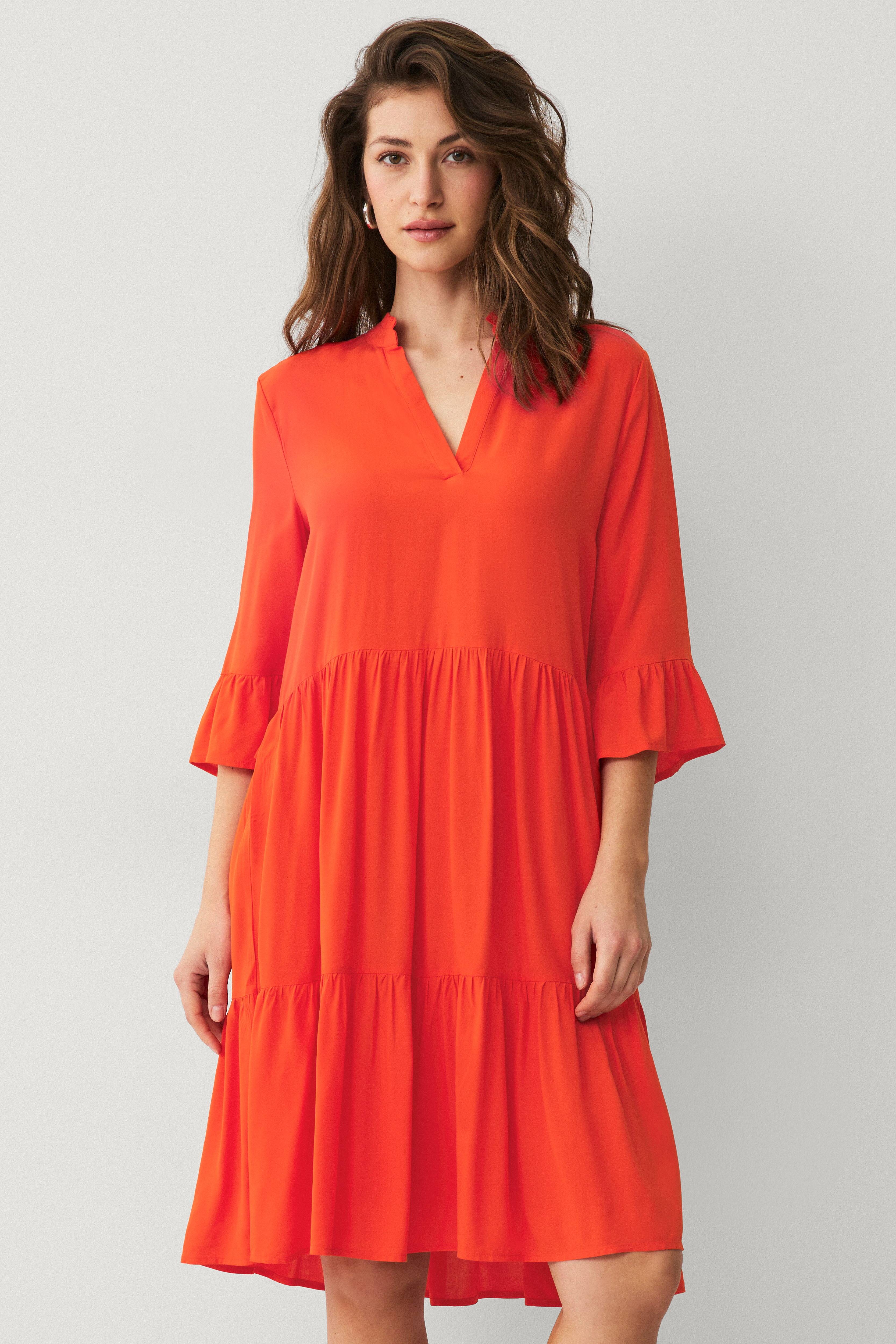 Saint Tropez Eda -mekko, jossa V-pääntie. Röyhelöommeltu hameosa ja 3/4-pituiset hihat, joissa röyhelö. Pääntiessä pieni laskostettu reuna. Pituus n. 102 cm koossa S.