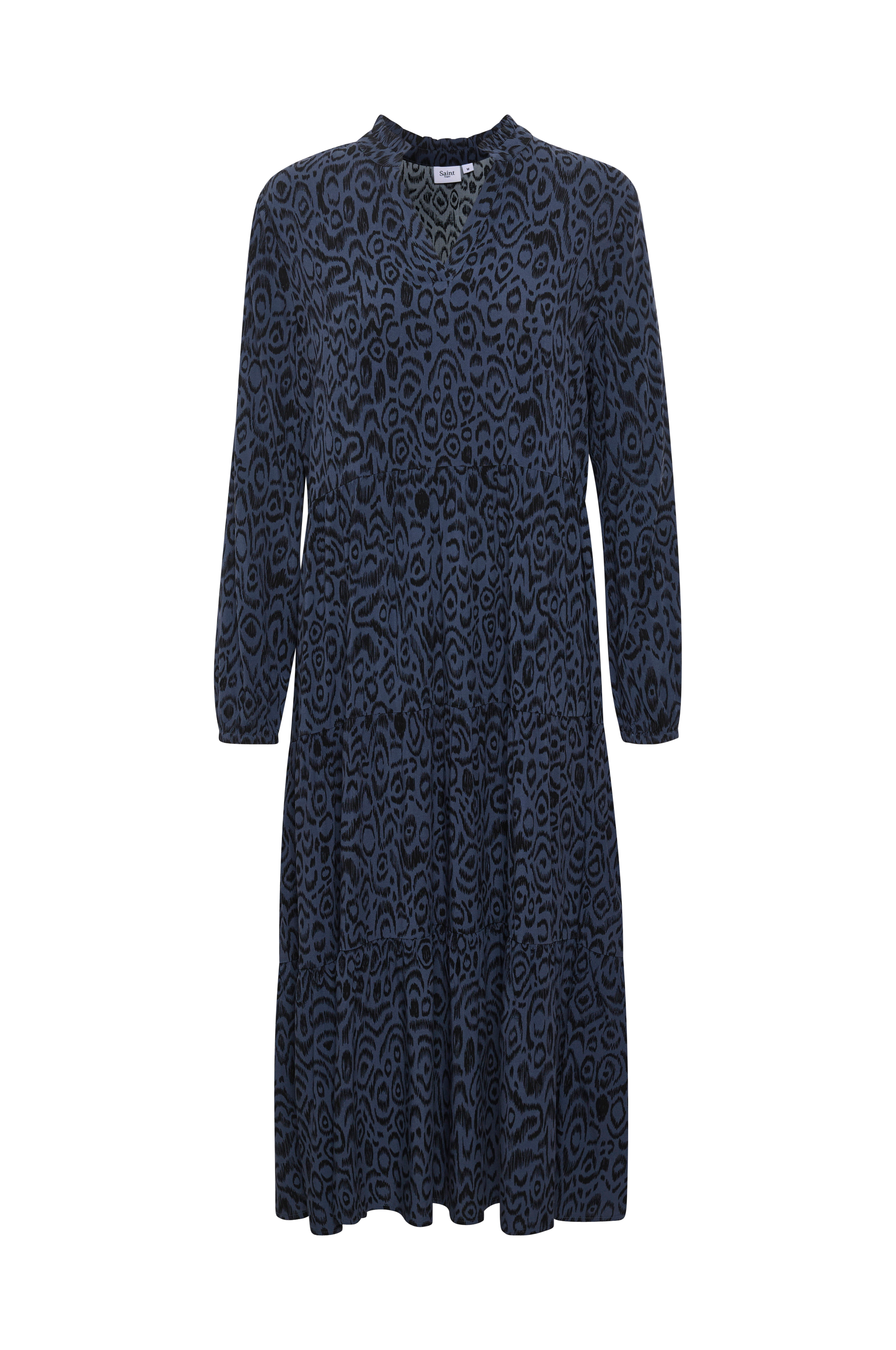 Saint Tropez EdaSZ Maxi Dress -mekko. V-pääntie edessä ja pieni röyhelöreuna pääntiessä. Pitkät hihat, joissa upotettu kuminauha hihansuissa. Poikkileikkaus vyötäröllä, leveä helmaosa ja päälle ommeltu röyhelö helmassa. Pehmeästi laskeutuvaa kangasta. Pituus n. 125 cm koossa S.