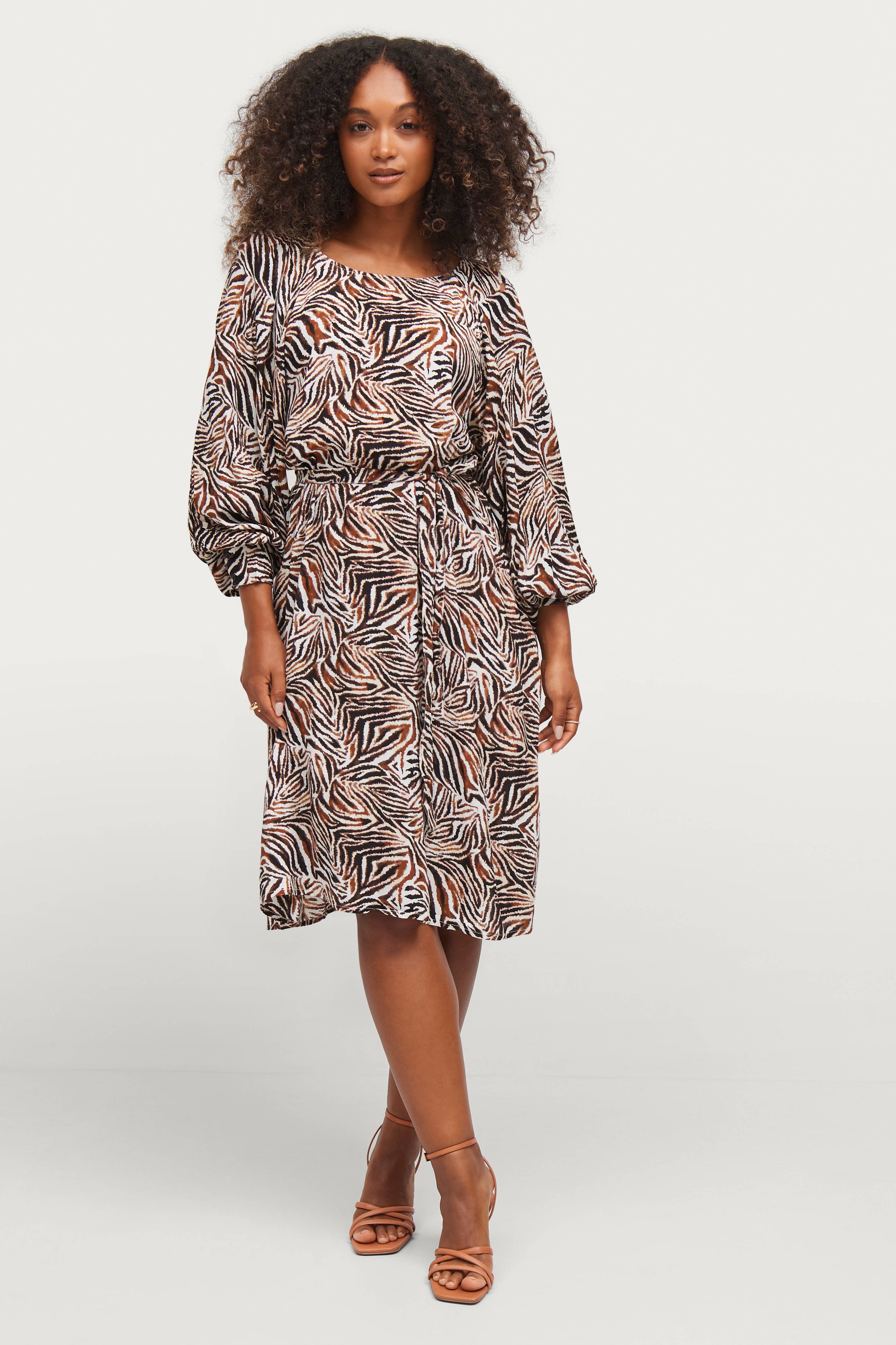 Mekko kuviollista viskoosia. Tilavat pussihihat, joissa kalvosimet. Laskos olkapäillä ja solmimisvyö vyötäröllä. Pituus n. 112 cm koossa S.