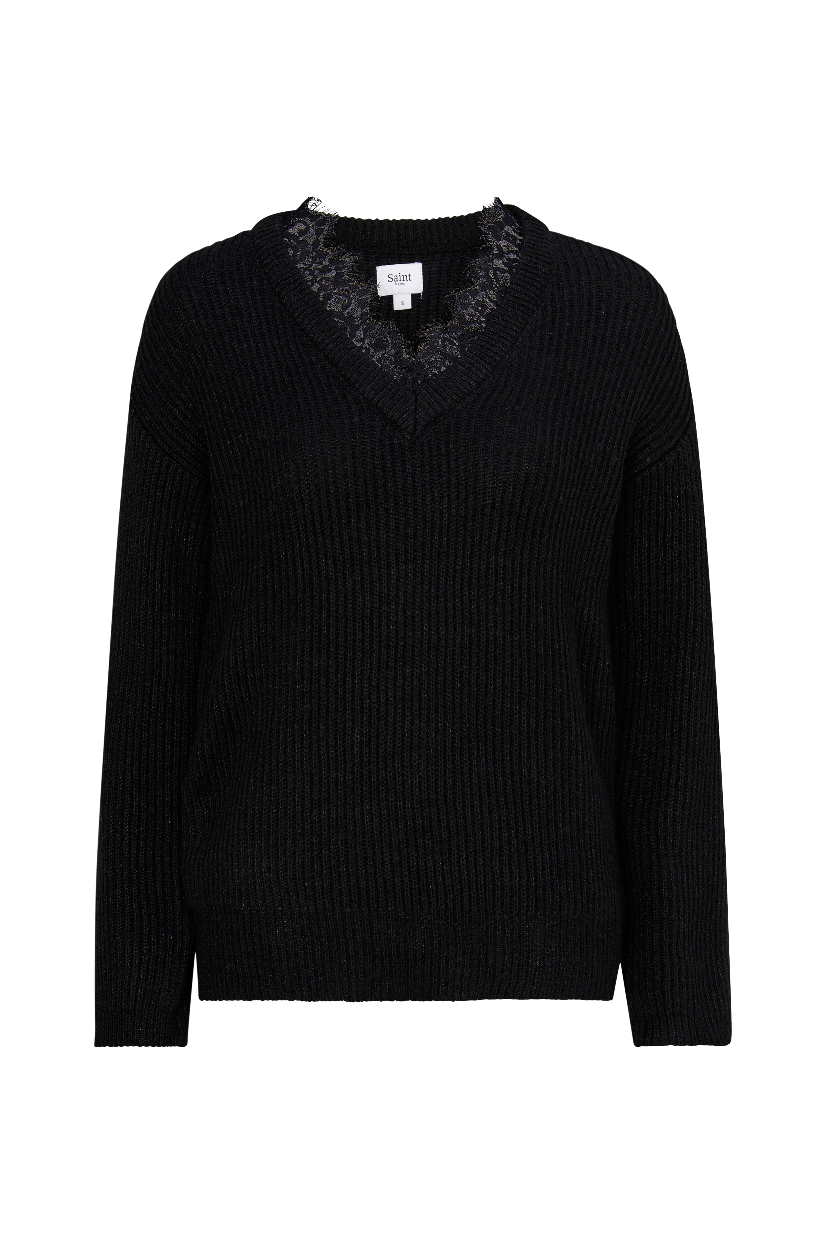 Saint Tropez -neulepusero pehmeää joustinneuletta. Suora malli ja V-pääntie, jossa kaksinkertainen joustinneulereuna ja hieno pitsiupotus. Leveä joustinneulereuna hihansuissa ja hieman leveämpi joustinneulereuna helmassa.