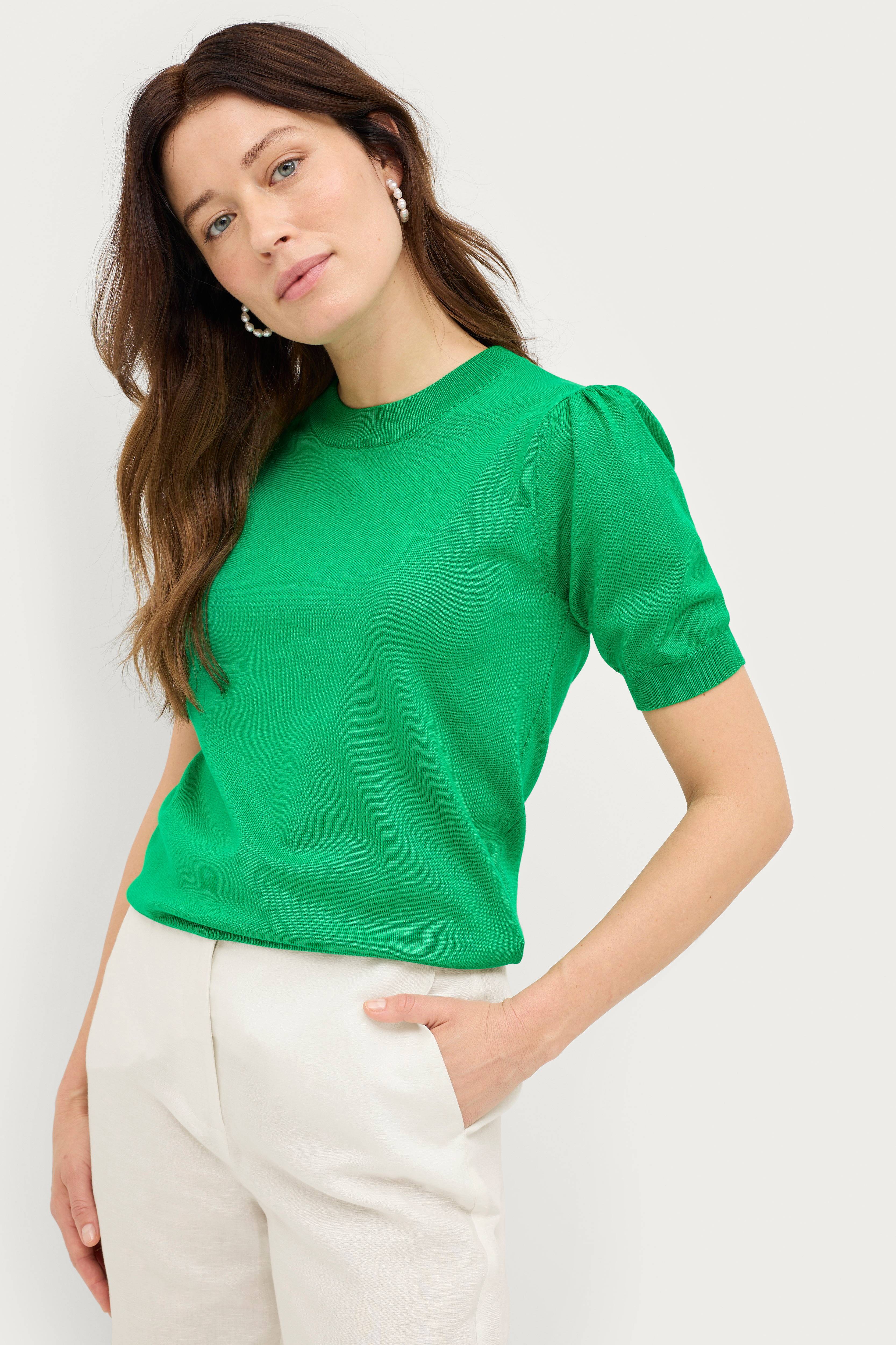 • Tiheäsilmukkainen paita• Pyöreä, ribattu kaula-aukko• Lyhyt hiha ribatulla reunalla• Ribattu helma