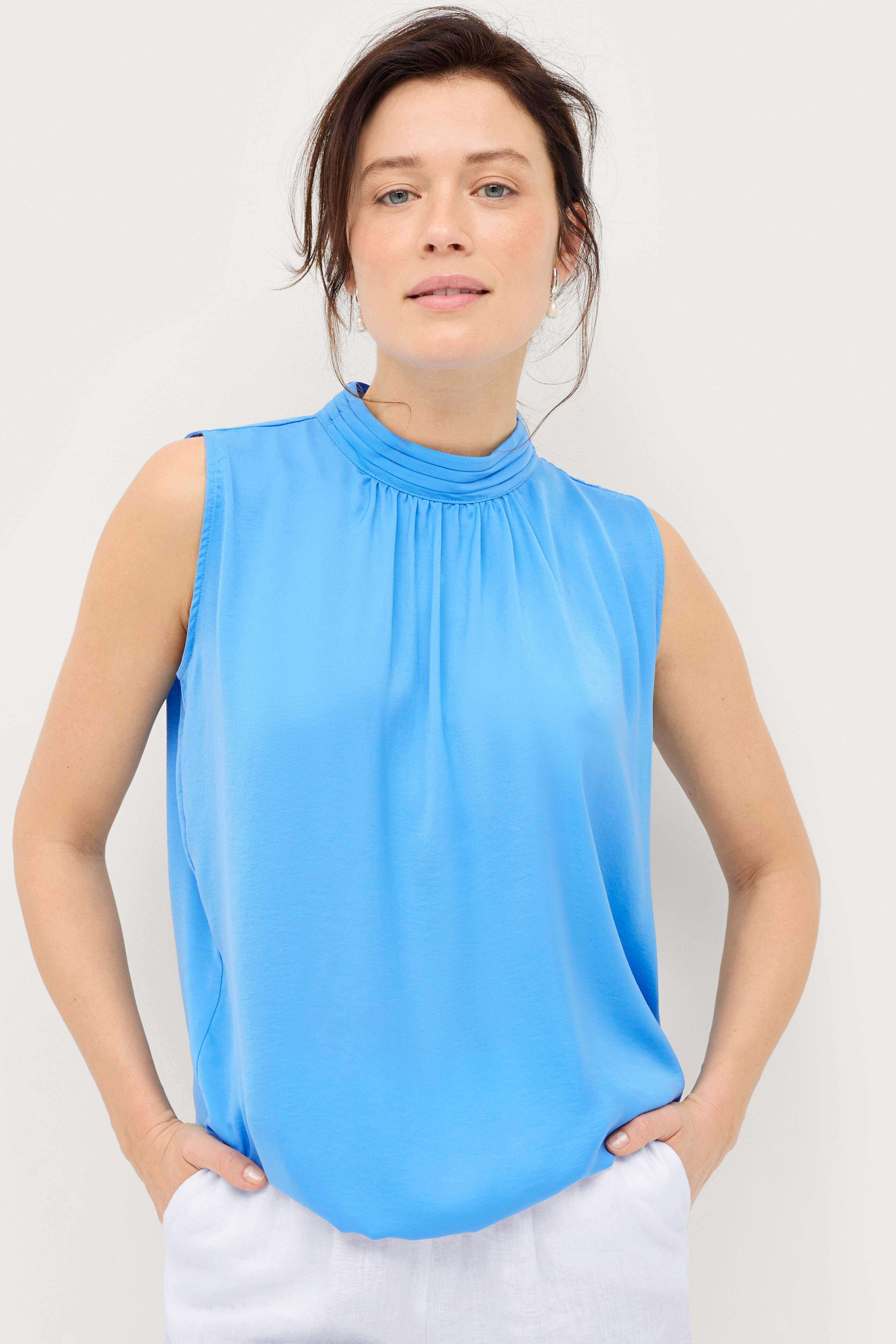 Saint Tropez Aileen Top -pusero. Hihaton, suora malli, poimutus pääntiessä ja puolikorkea kaulus, jossa ommellut laskokset ja halkio ja napit niskassa. Pehmeästi laskeutuvaa materiaalia.