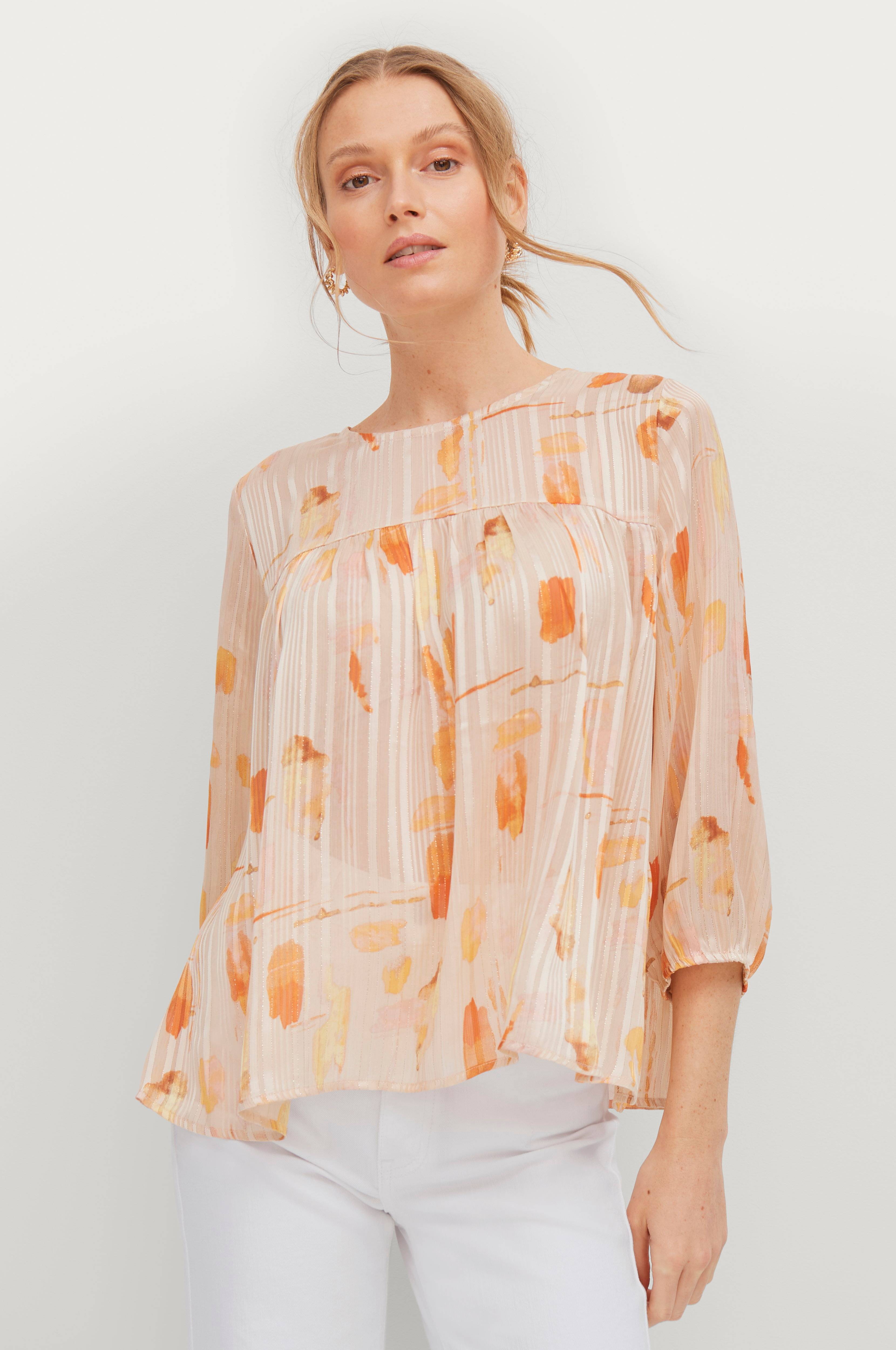 • Leveä malli• Rypytys rintamuksessa ja selässä• 3/4-pituiset hihat joustavilla hihansuilla• Halkio napilla niskan kohdalla• Valmistettu läpinäkyvästä sifongista kimallelangalla