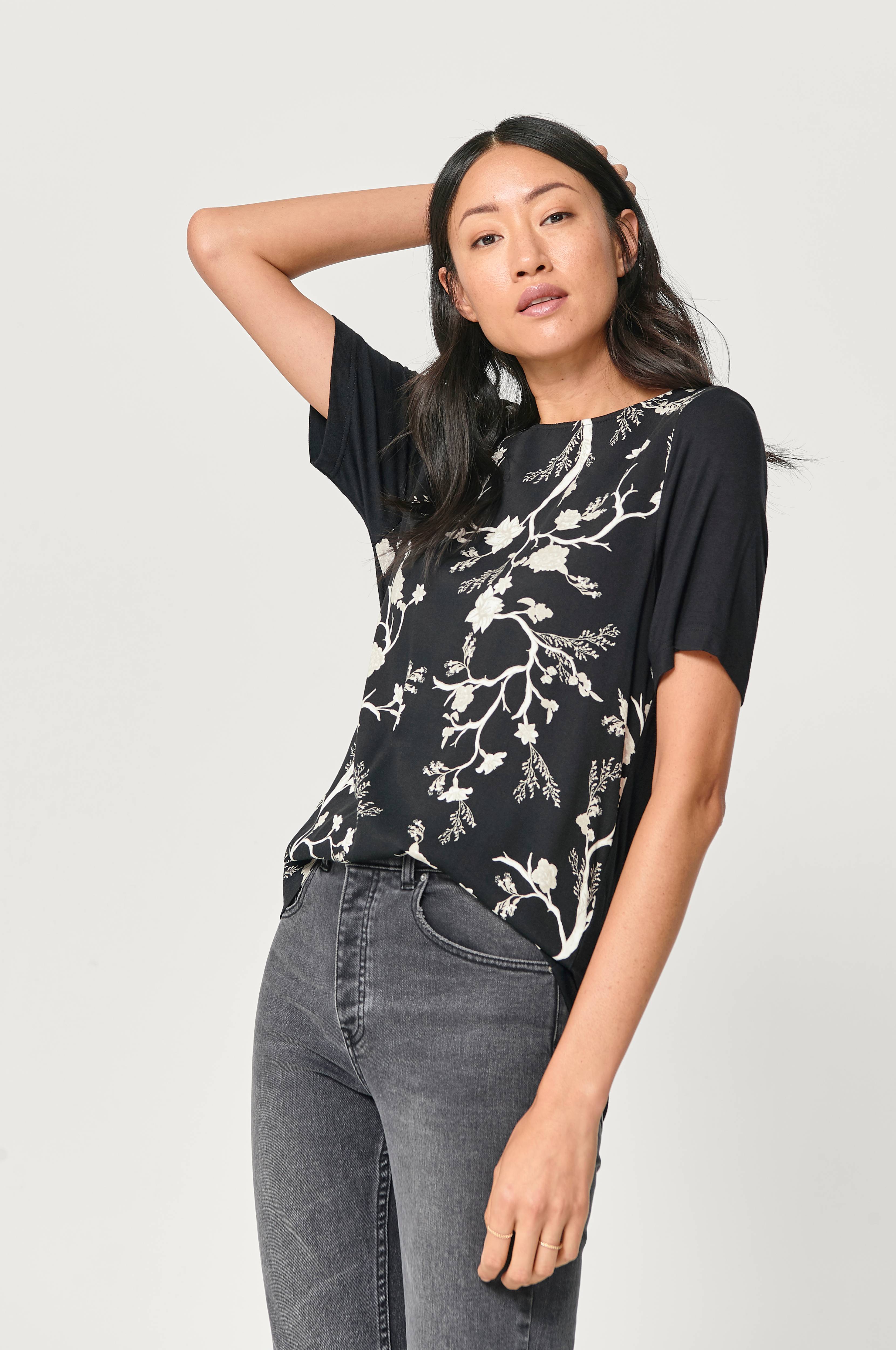 Saint Tropez -pusero. Suora ja rento malli pehmeää ja myötäilevää trikoota, etukappale kuviollista kangasta. Pyöreä pääntie, jossa kapea päärme. Tyylikäs, takaa pyöristetty helma.