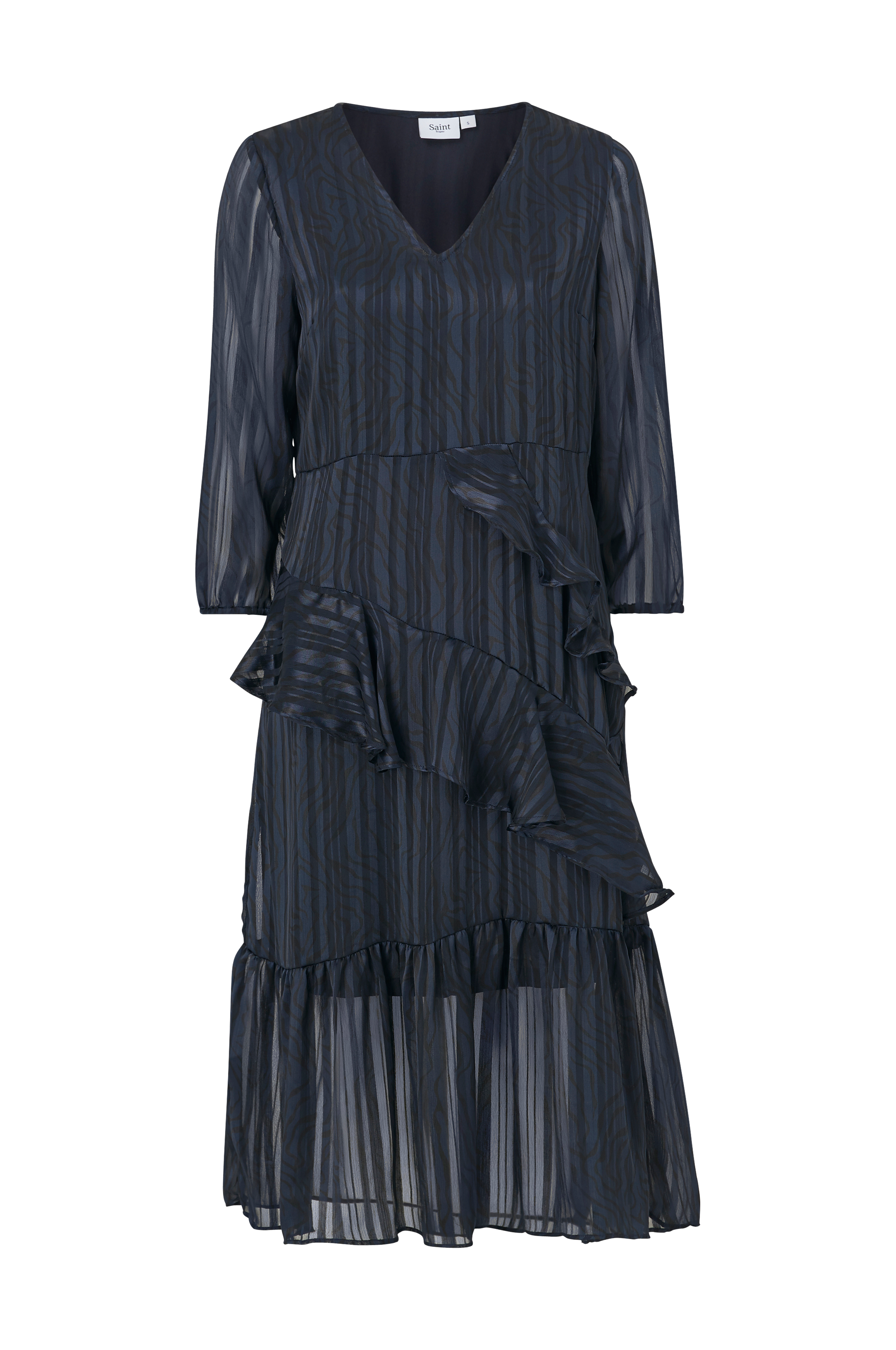 Pohjepituinen Saint Tropez -mekko, jossa V-pääntie edessä ja päälleommellut röyhelöt hameosassa edessä. 3/4-pituiset hihat, hihansuissa kuminauha. Piilovetoketju toisella sivulla. Kiiltävää raidallista kangasta. Lyhyt trikoovuori. Vuorittomat hihat. Pituus n. 118 cm koossa S.