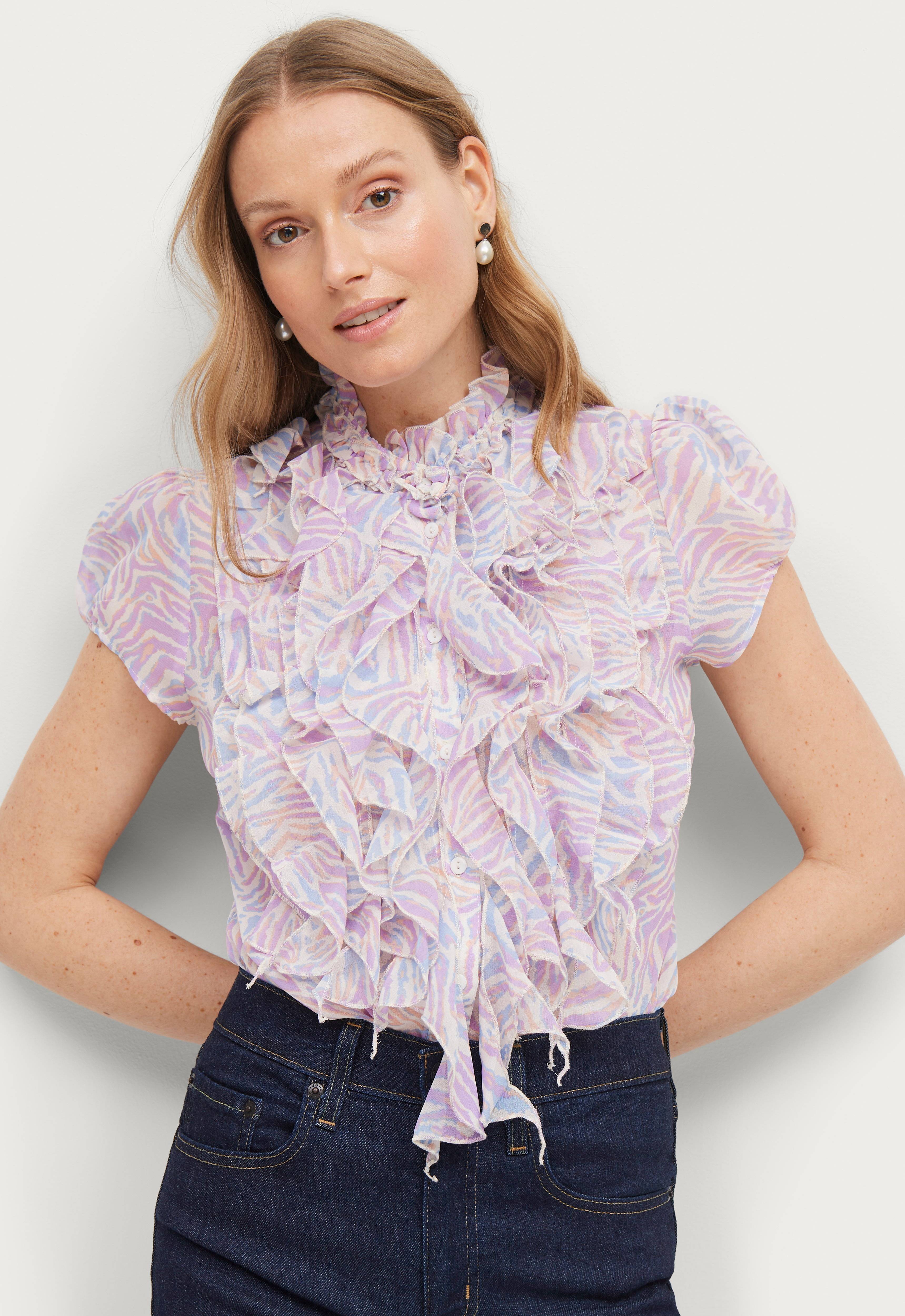 Saint Tropez LillySZ SS Shirt -röyhelöpaita. Hieman vartalonmyötäinen malli, jossa röyhelö pääntiessä ja monta päälleommeltua röyhelöä rinnassa. Lyhyet hihat, joissa pieni upotettu kuminauha yläsivulla. Sifonkia.