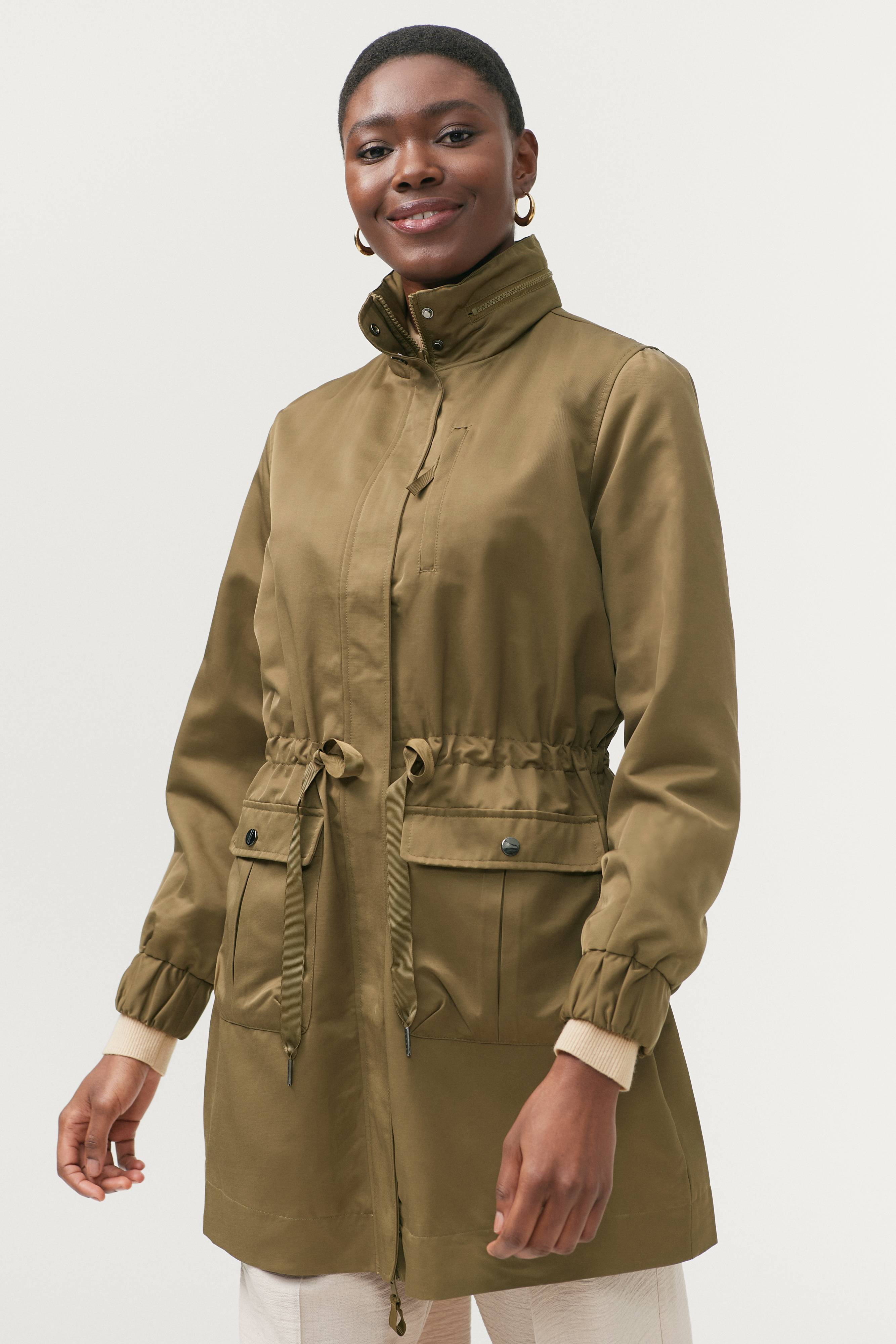 Upotetut solmittavat nauhat edessä vyötäröllä. Nappilista, jossa kaksisuuntainen piilovetoketju ja painonapit. Korkea kaulus, jossa painonapit edessä ja upotettu huppu takana. Upotettu vetoketjullinen rintatasku ja kaksi isoa kannellista taskua. Leveä, upotettu kuminauha hihansuissa. Pituus n. 88 cm koossa S.