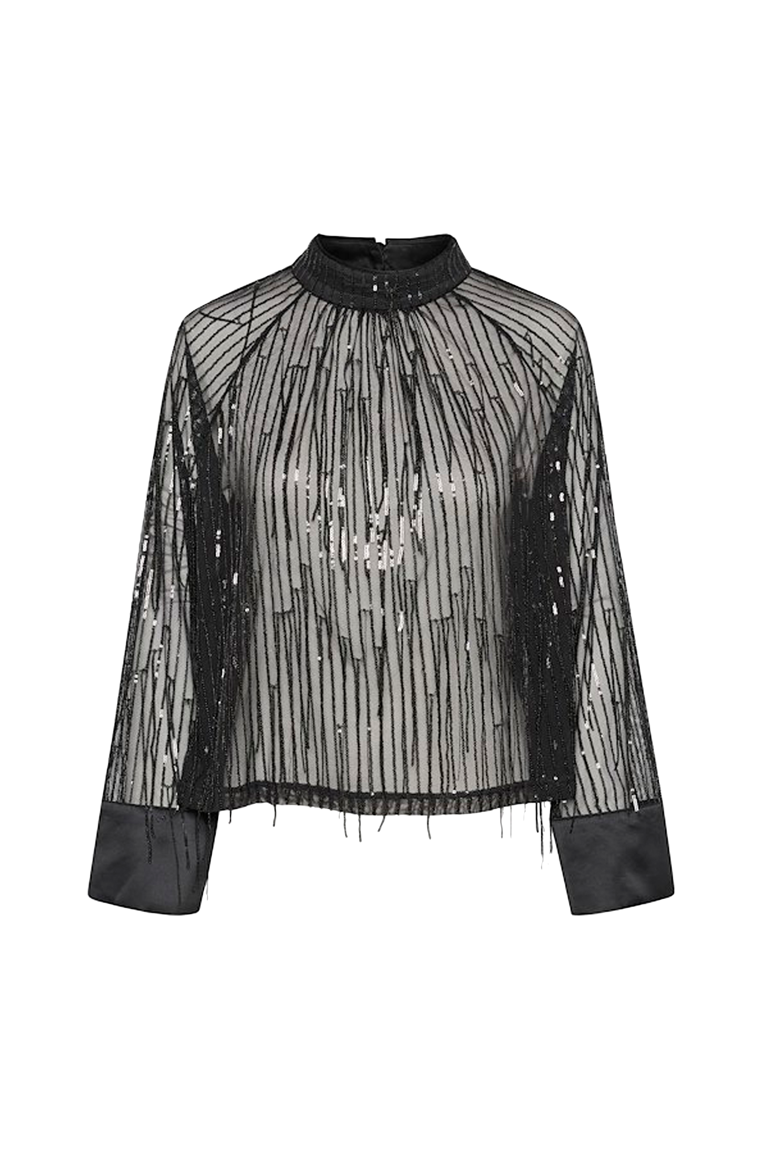 • Suora, hieman läpinäkyvä malli verkkokankaasta kirjailluilla paljeteilla joka puolella• Puolikorkea kaulus napeilla niskan kohdalla• Suorat raglanhihat kudotulla hihansuulla