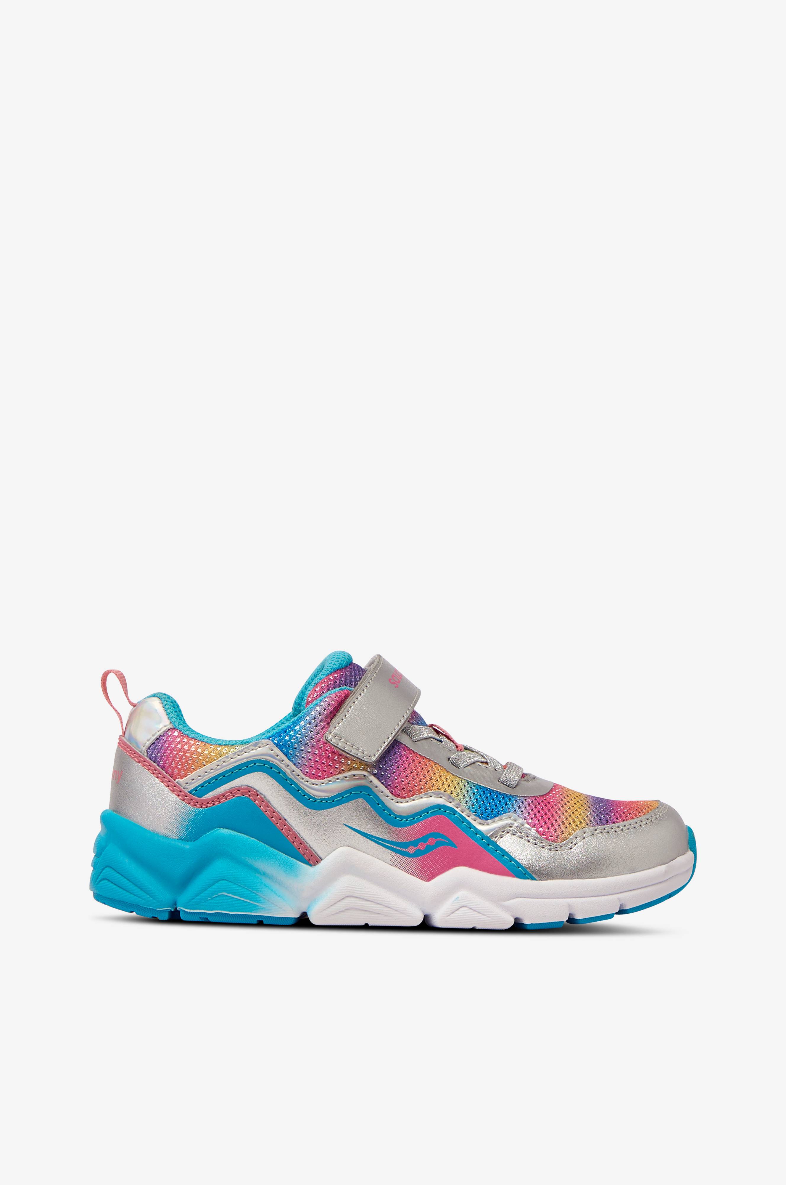 Saucony S-Flash A/C 2.0 -tennarit, joiden sateenkaarenvärinen ja hopeanhohtoinen päällinen nahkaa ja hengittävää kangasta. Tarranauharemmi ja joustava pikanyöritys. Kevyt ja vaimentava EVA-välipohja. Mukava topattu läppä ja varren reuna. Kangaslenkki takana.