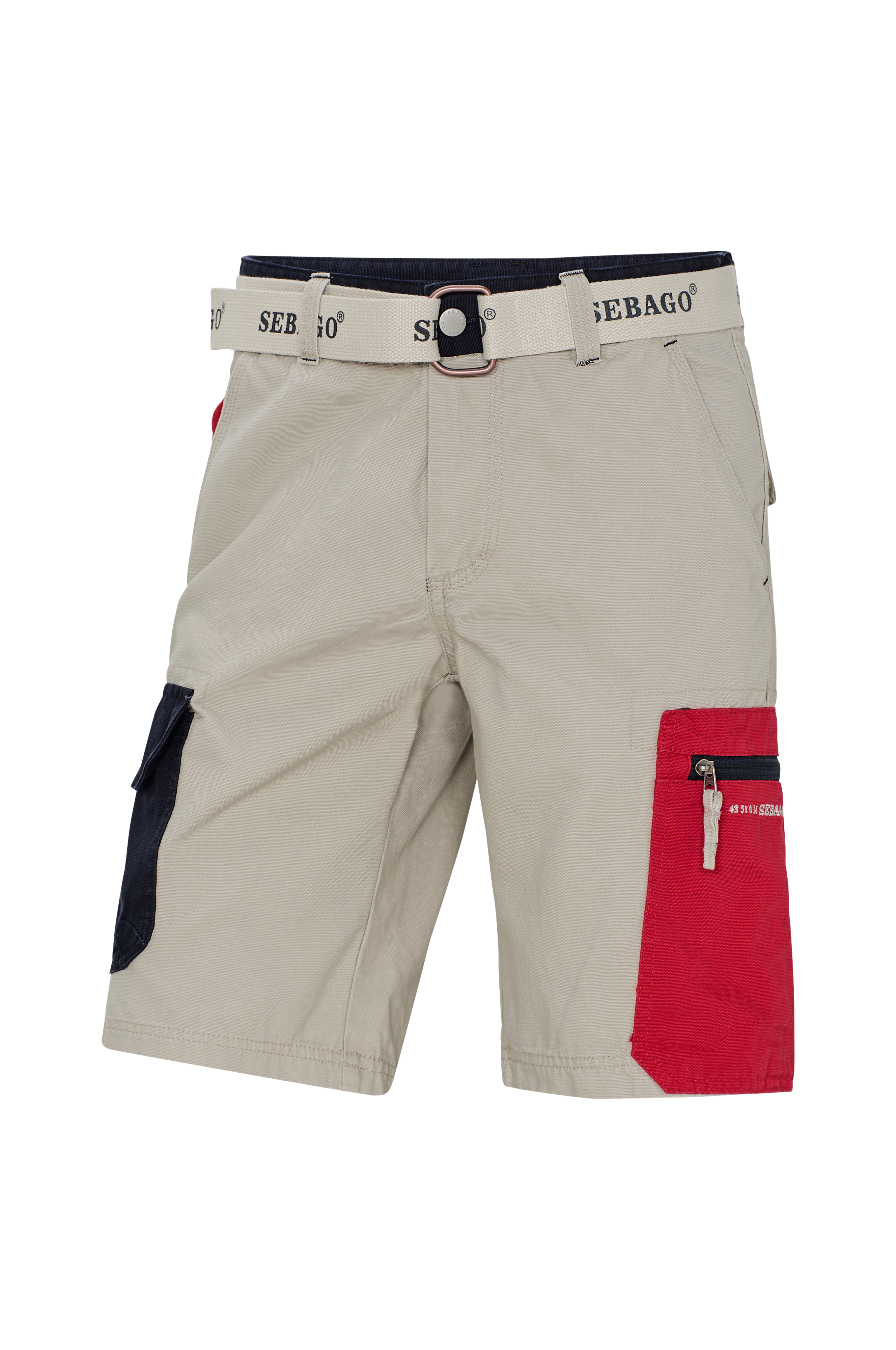 Sebago Red Pocket Shorts -cargoshortsit napakkaa puuvillaa. Vyötärönauhassa nappi, vyölenkit ja vyö, jossa Sebago-painatus ja metallisolki. Etuhalkiossa vetoketju. Kolme etutaskua, joista yksi vetoketjutasku. Kaksi takataskua, joissa kansi ja painonappi. Kaksi reisitaskua, joista yksi vetoketjullinen ja toisessa kansi ja nappi. Lahkeen sisäpituus n. 26 cm koossa M.