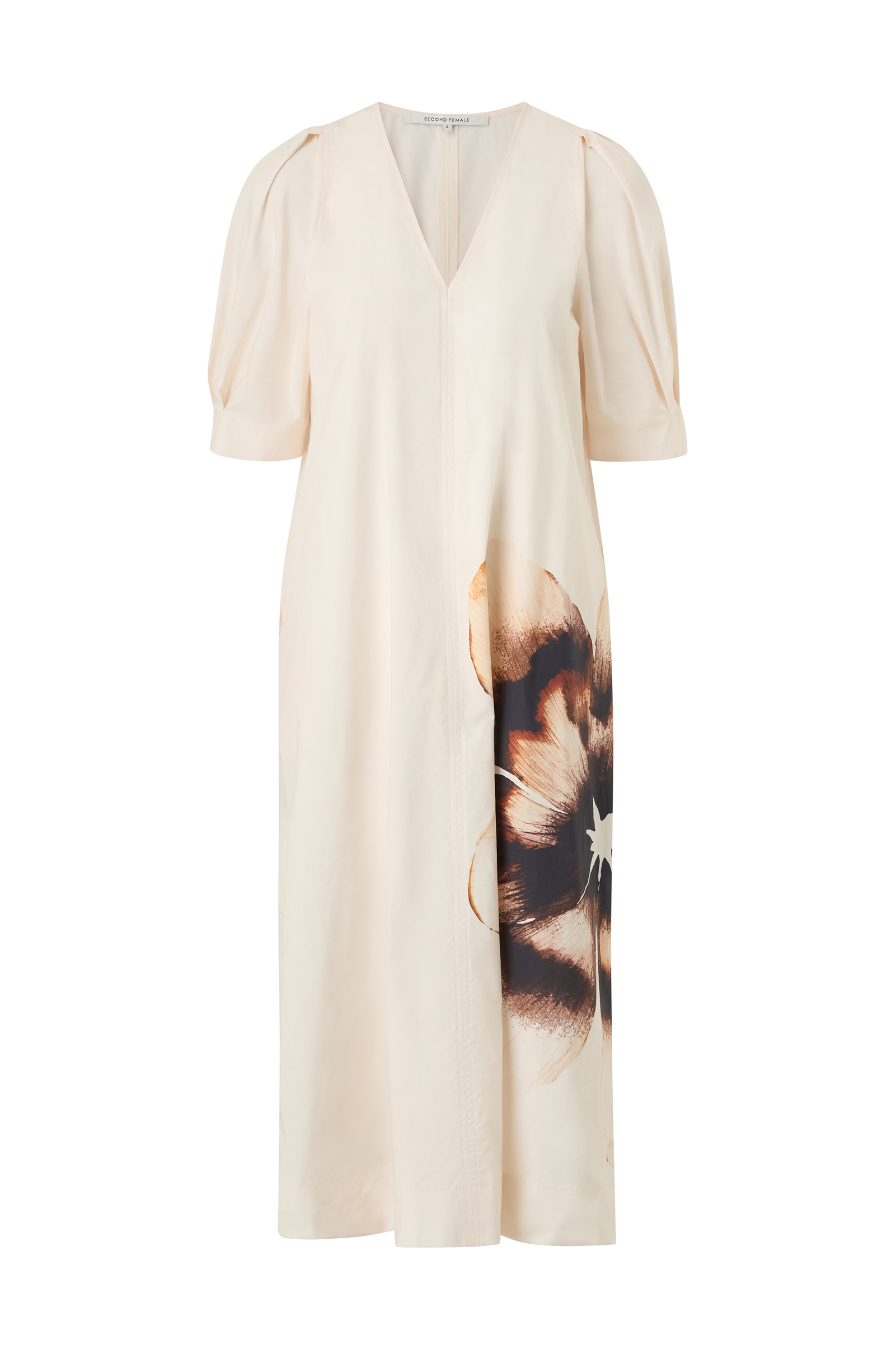 • A-linjainen leikkaus• V-kaula-aukko• Lyhyet bubble-hihat• Sivutaskut• Pituus: 122 cm koossa S