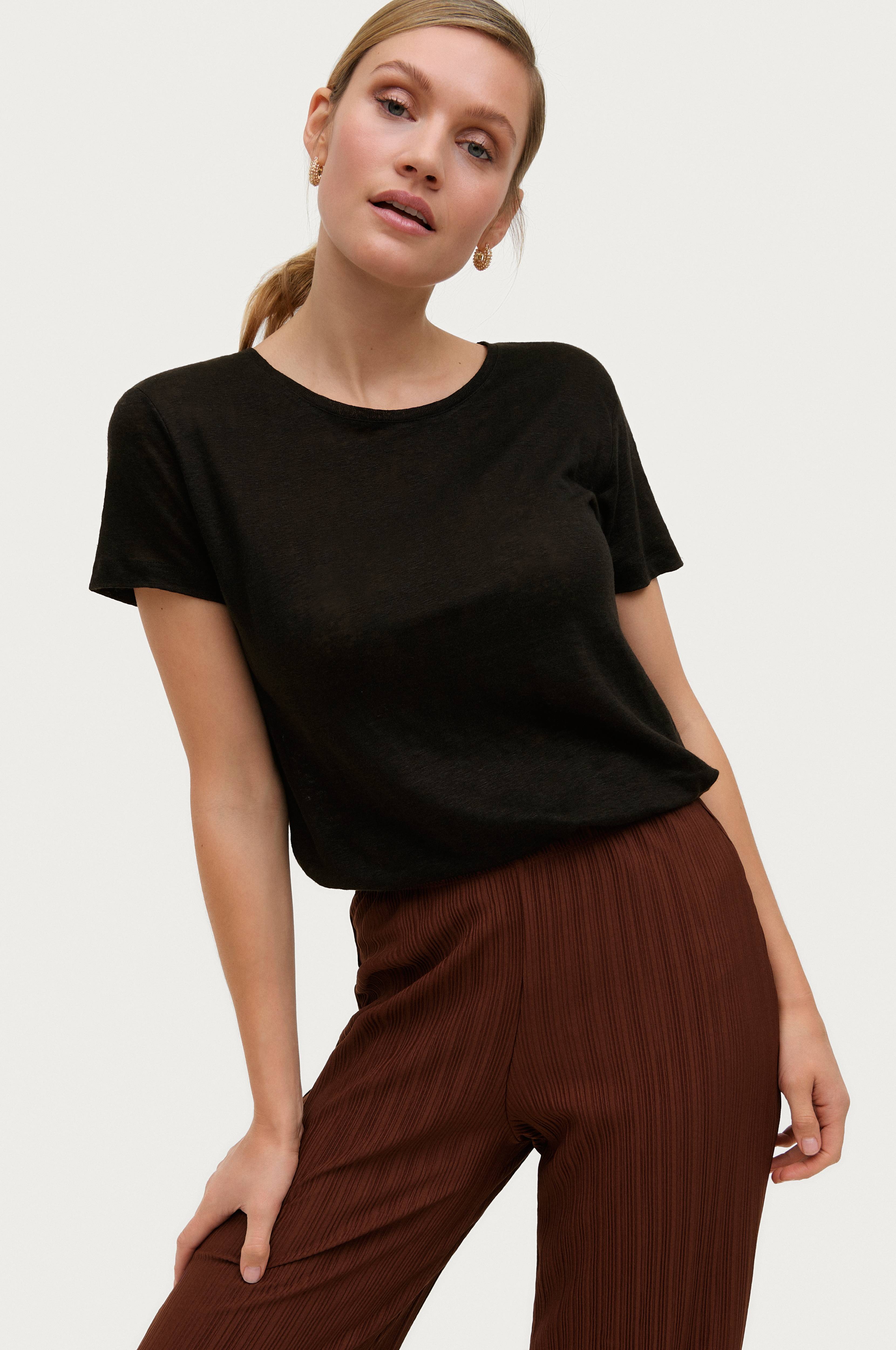 Second Female Peony O-neck Tee -pusero ilmavaa pellavaa. Lyhyet hihat ja pyöreä pääntie, jossa kapea joustinneulosreuna.