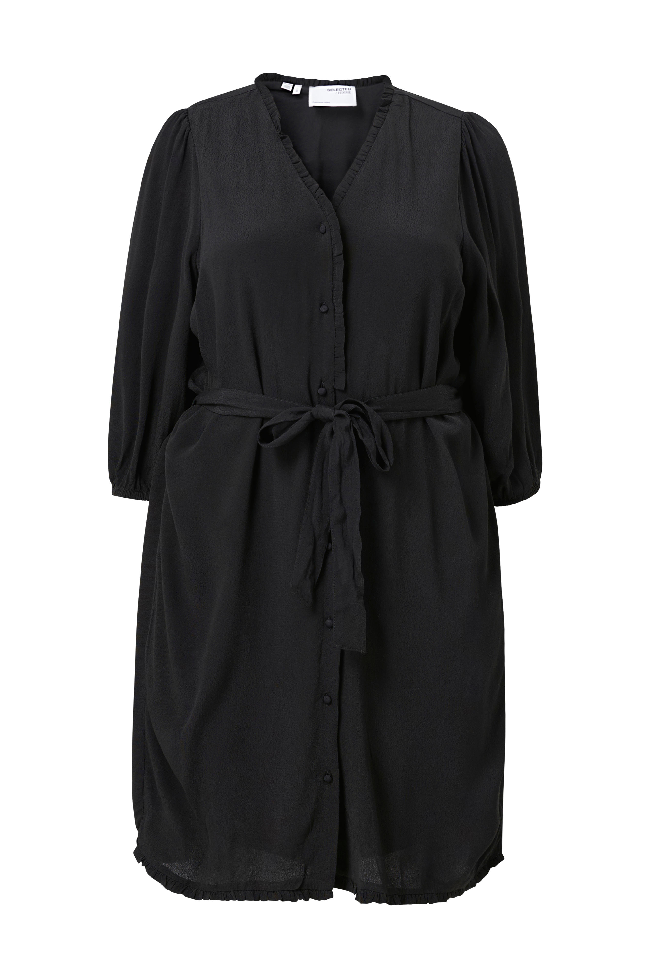 Mekko kreppimateriaalia, jossa hyvin laskeutuva trikoovuori. V-pääntie ja päällystetyt napit edessä. Solmimisvyö vyötäröllä, 3/4-pituiset pussihihat ja hihansuissa kuminauha. Kapea röyhelöreuna pääntiessä ja helmassa. Pituus n. 106 cm koossa 44.
