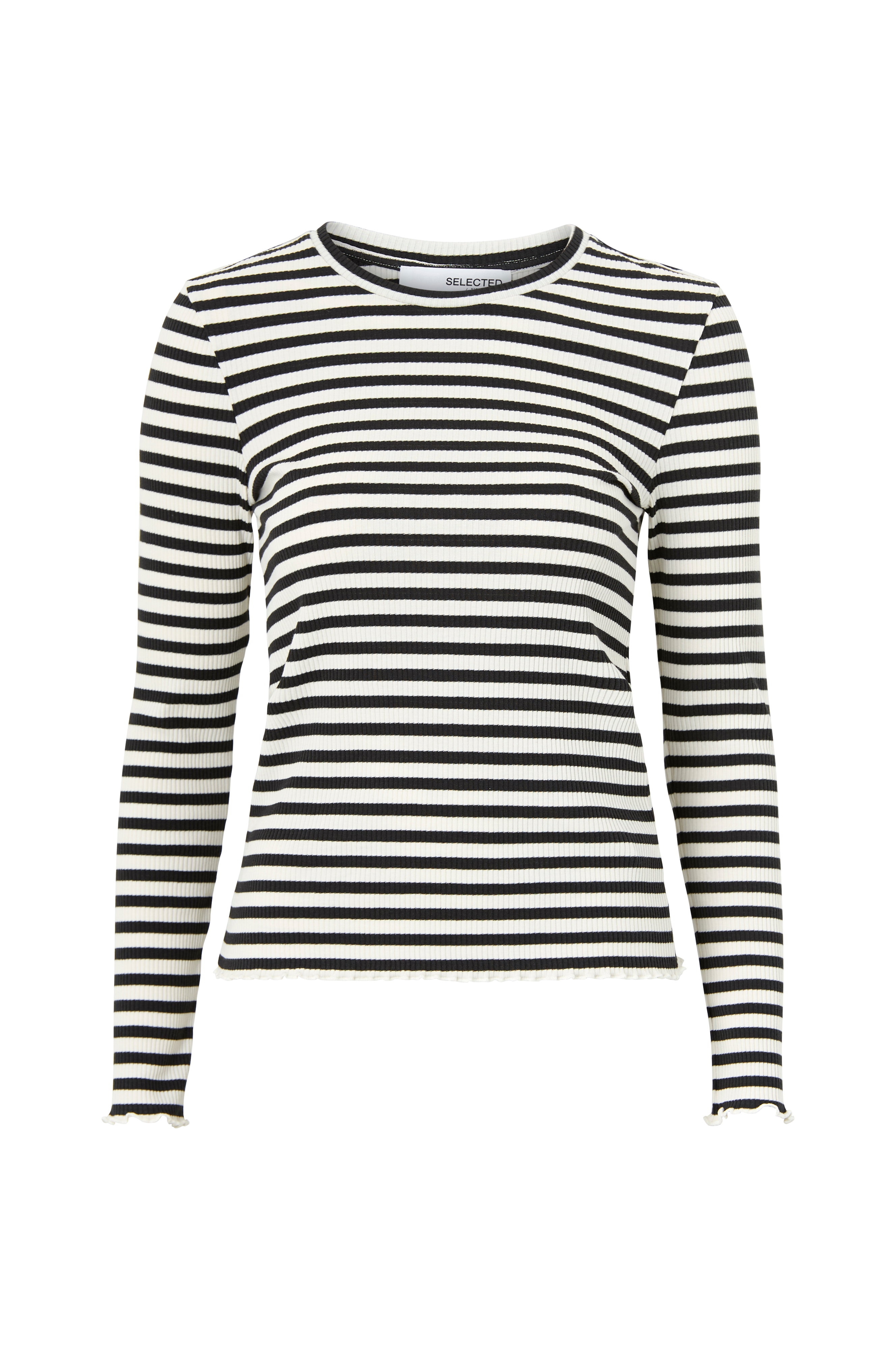 Raidallinen joustinneulospusero ekologista puuvillatrikoota. Vartalonmyötäinen malli, jossa pitkät hihat. Aaltomainen reuna helmassa ja hihansuissa.