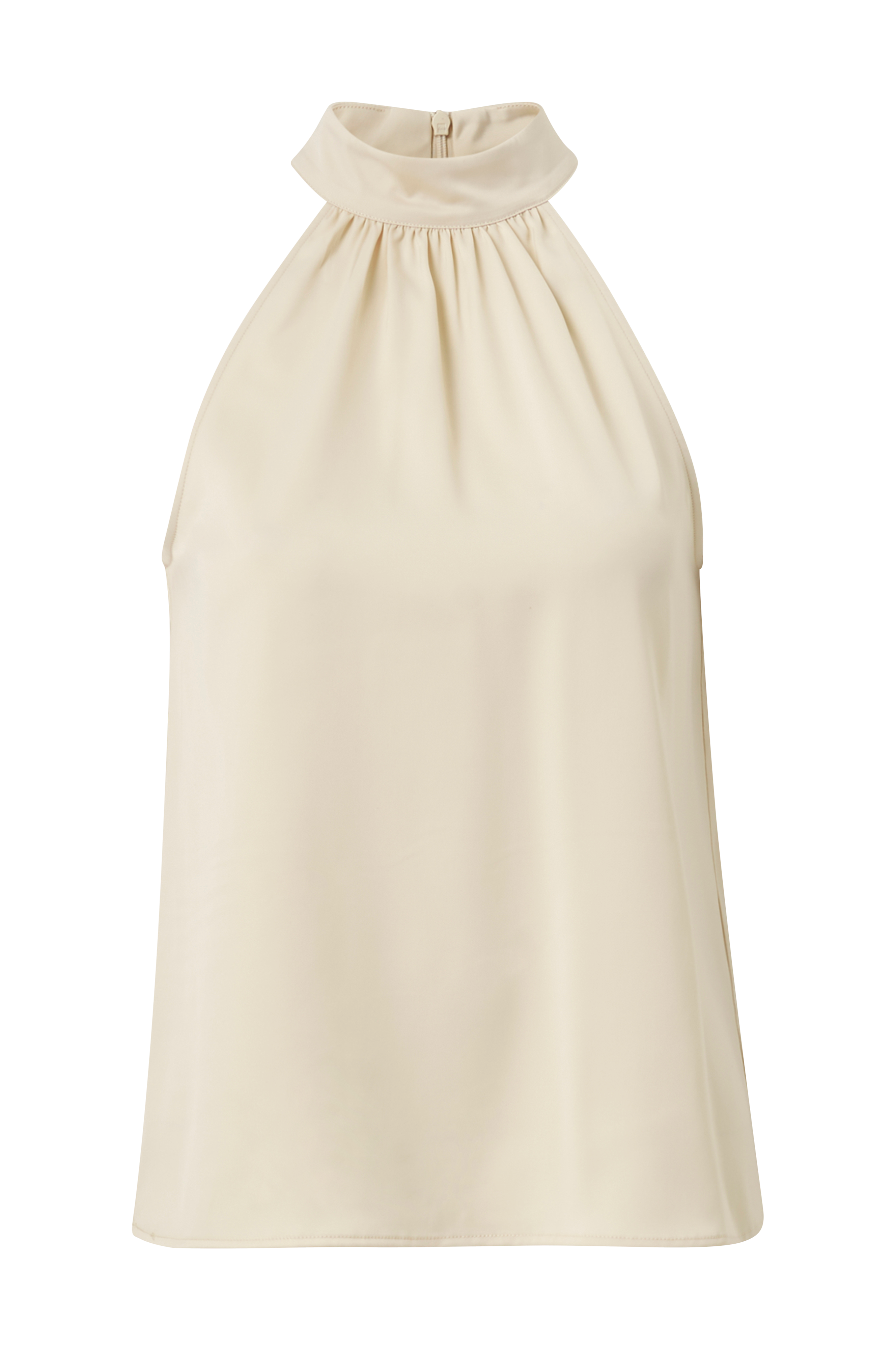 Hihaton pusero/toppi kauniisti hohtavaa satiinia. Halterneck-malli, jossa korkea pääntie. Piilovetoketju selässä.