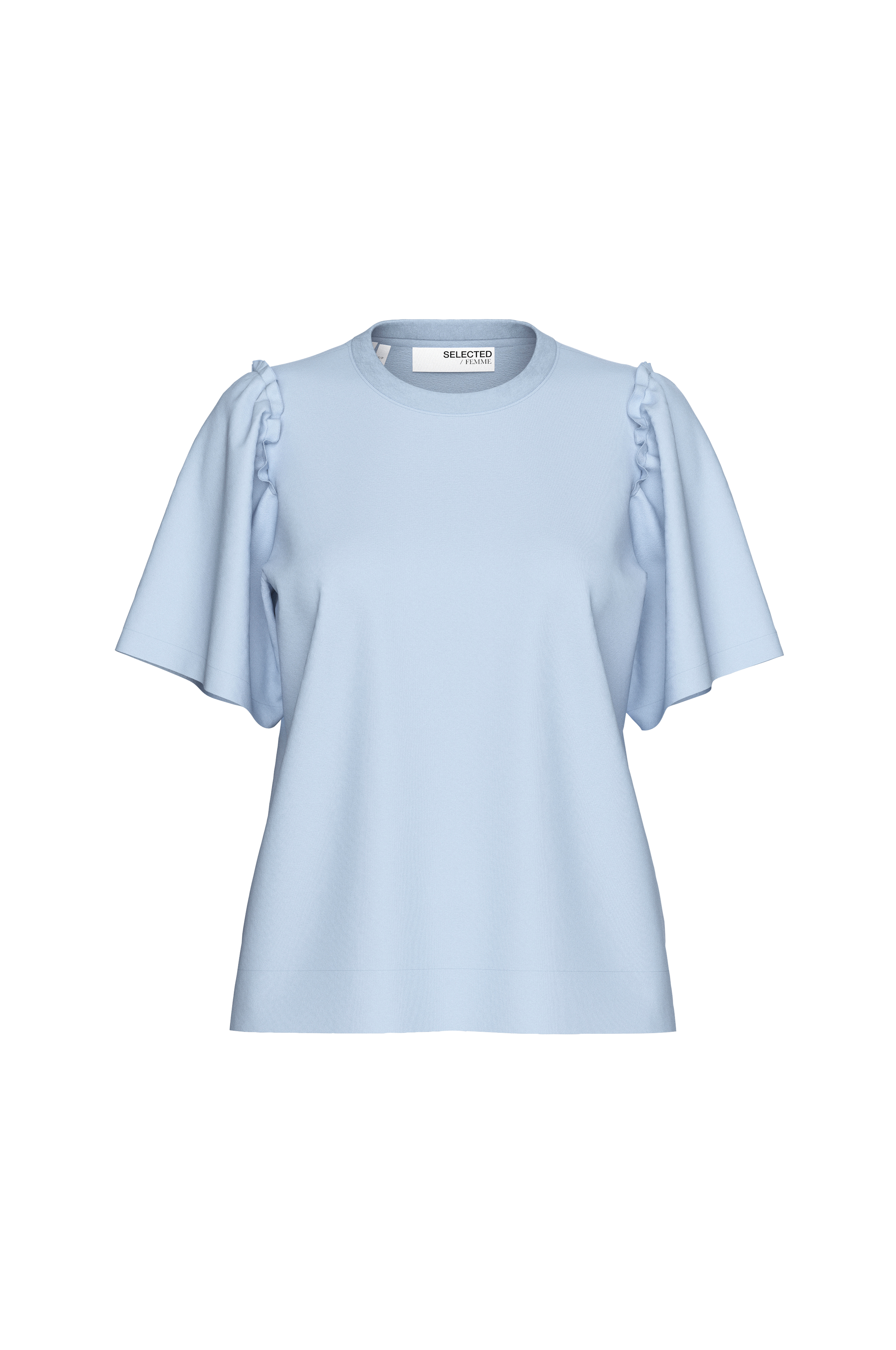 • Toppi puuvillajersey-kankaasta• Lyhyet, leveät hihat• Röyhelöt olkapäissä• Pyöreä pääntie