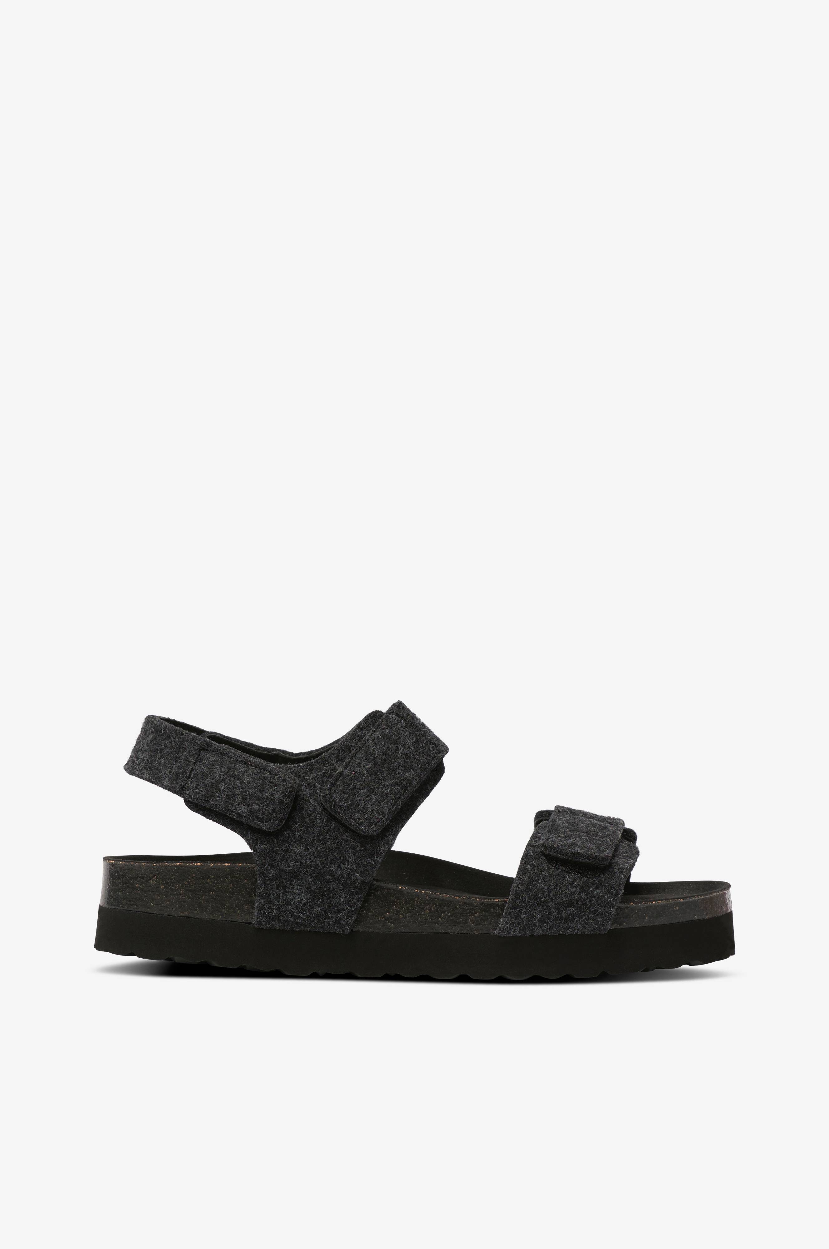 Sandaalit, joiden päällinen villaa. Jalan päällä kaksi säädettävää tarranauharemmiä ja yksi kantaremmi. Anatomisesti muotoiltu pohja mokalla päällystettyä korkkia. Kuviollinen ulkopohja.