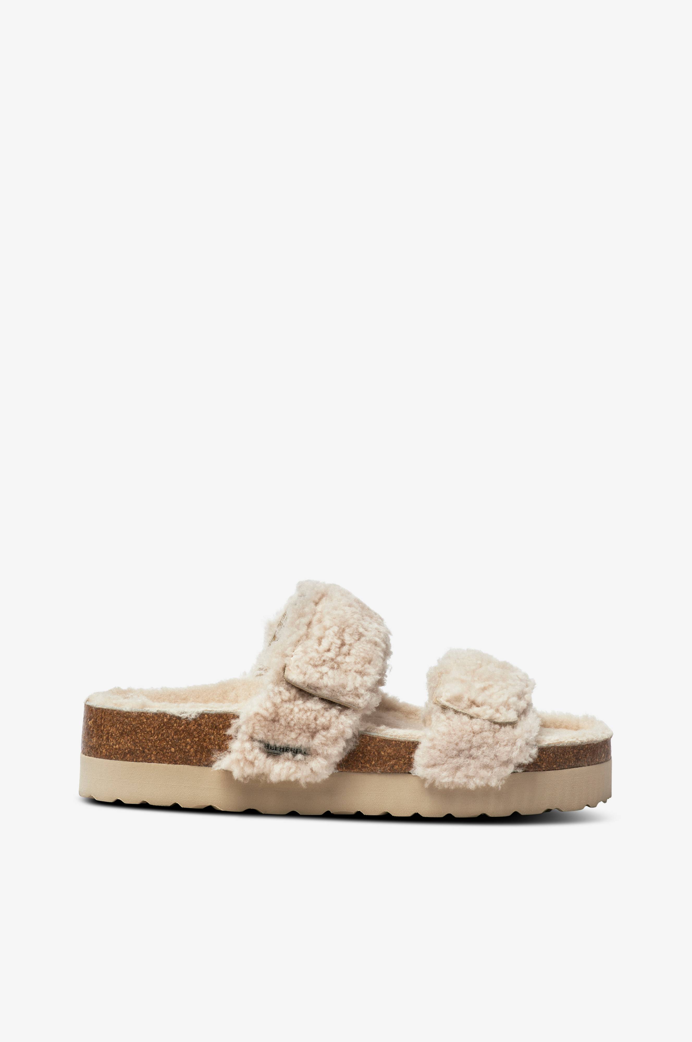 Sandaalit aitoa lampaankarvaa. Säädettävät tarranauharemmit. Jalan mukaan muotoiltu korkkipohja ja kuvioitu, kevyt ja vaimentava EVA-ulkopohja. Pohjan korkeus takaa n. 4 cm koossa 37.