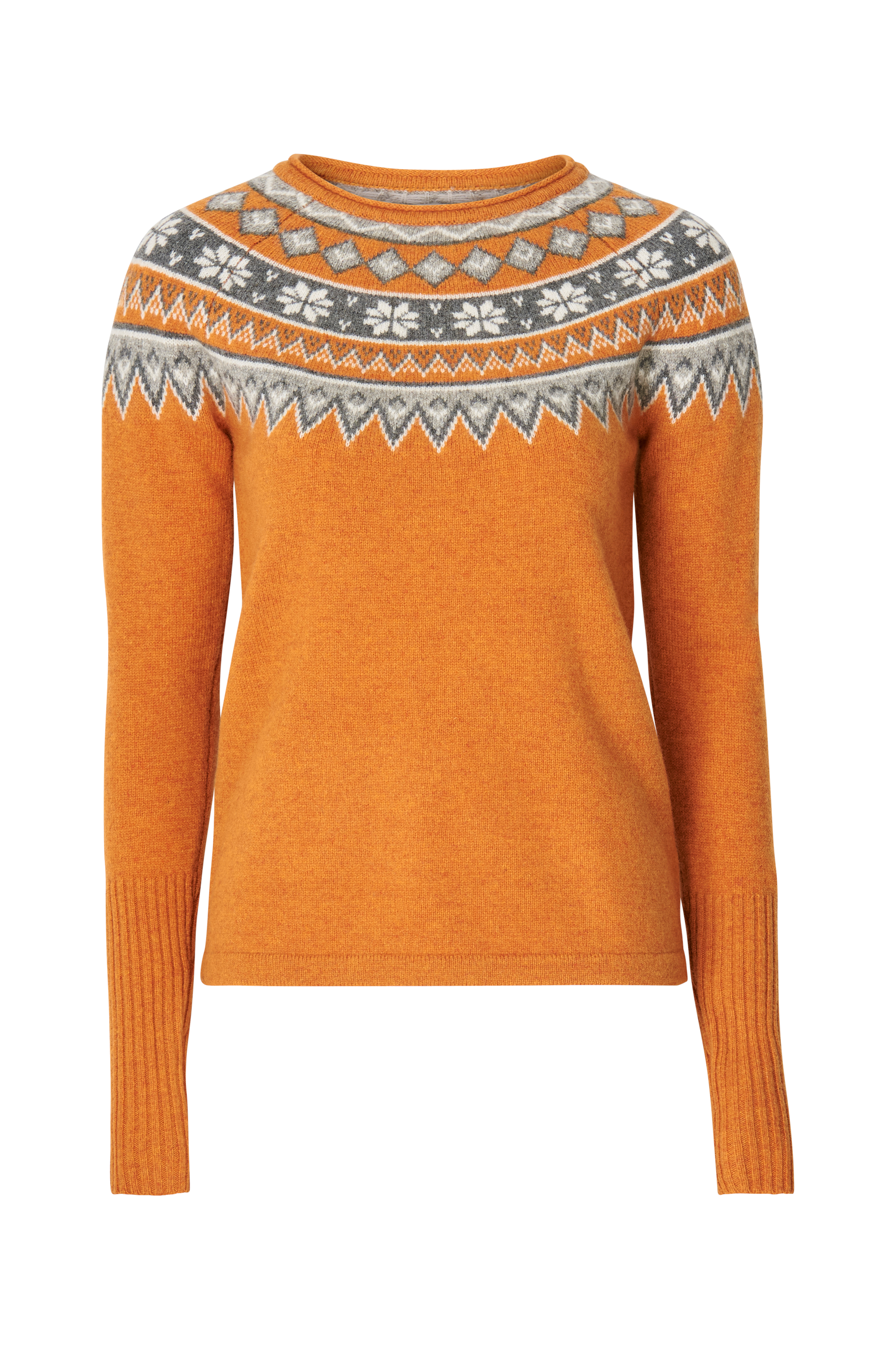 Skhoop Scandinavian Sweater -neulepusero. Tyylikäs malli sileää villasekoiteneuletta. Yläosassa pyöröneulottu kirjoneulekuvio. Pyöreä joustinneulepääntie, jossa rullareuna. Erittäin pitkät hihat ja leveä joustinneule hihansuissa.