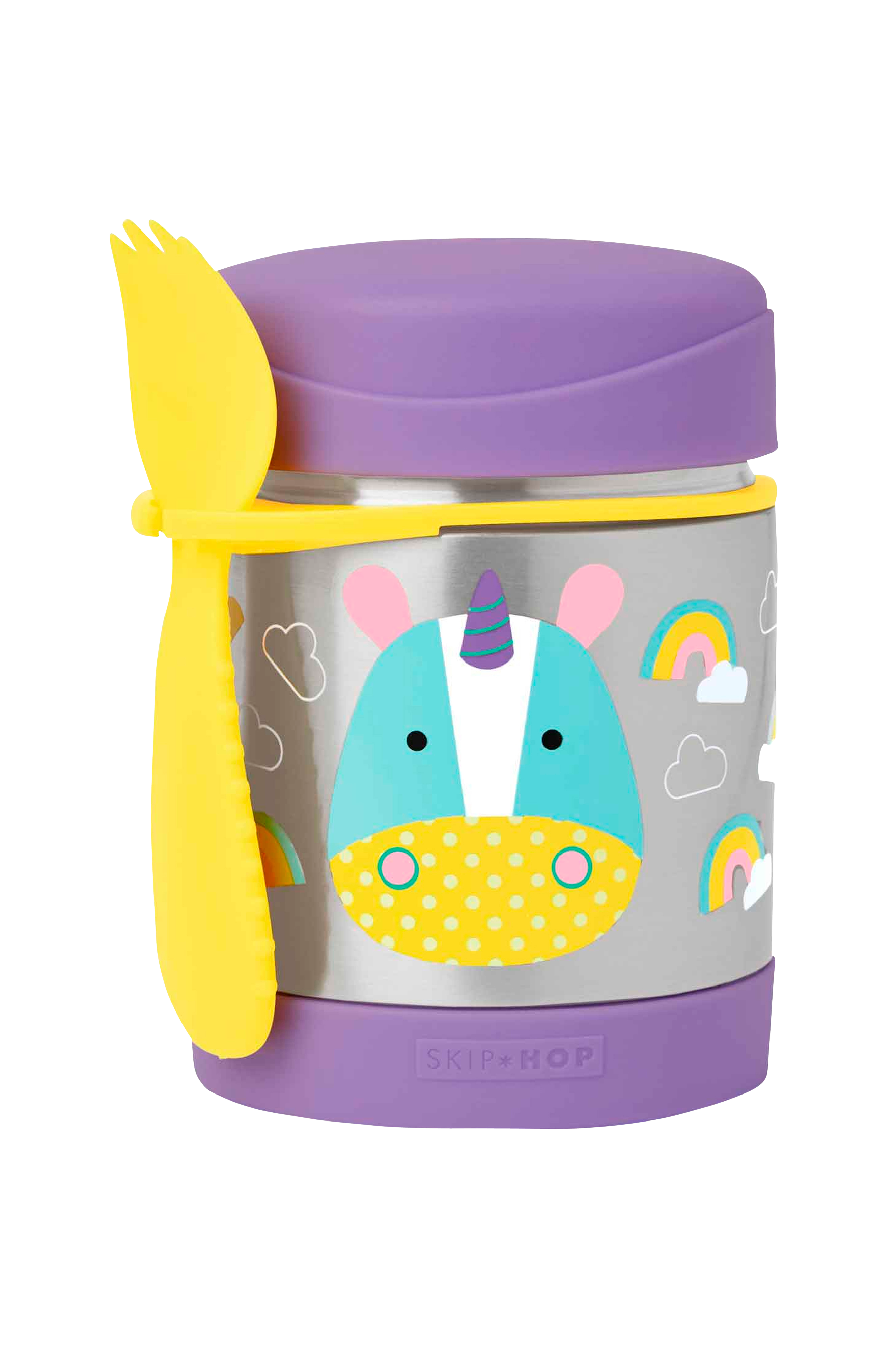 Värikäs Skip Hop -ruokatermos ruostumatonta terästä. Pitää lapsen ruoan lämpimänä tai kylmänä. Lusikka-haarukka on kiinnitetty kiinteään aterintelineeseen, johon voi kiinnittää myös muita aterimia. Termos pitää ruoan lämpimänä n. 5 tuntia. Tiivis kierrekorkki. Yhdistä Zoo-pulloon ja pakkaa kummatkin Zoo Pack -reppuun retkeä varten! Ei sisällä BPA:ta, PVC:tä eikä ftalaatteja.
