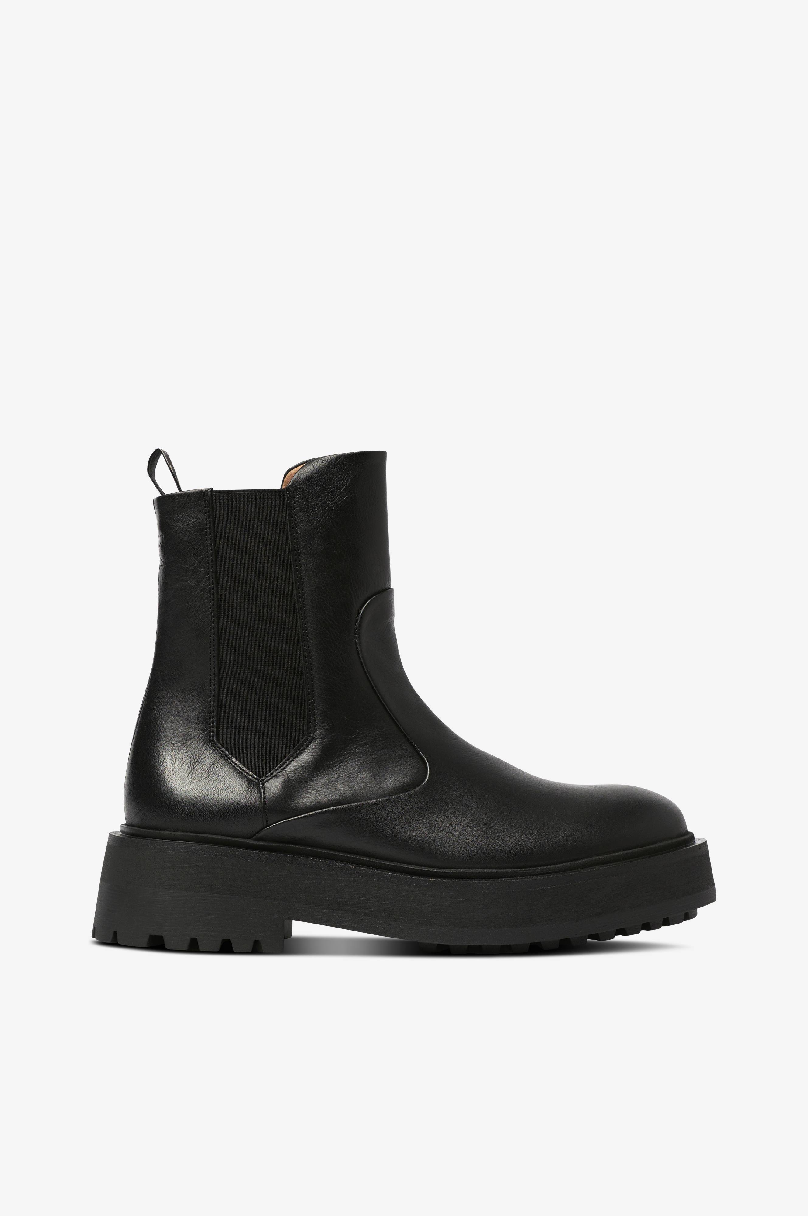 Nahkanilkkurit, joissa korkea, karkeakuvioinen pohja. Varren ulkosivulla upotettu venyke, sisäsivulla vetoketju, jossa pitkä tamppi, ja takana vetolenkki.Varren korkeus n. 15 cm.Koron korkeus n. 5 cm.Pohjan korkeus n. 3 cm.