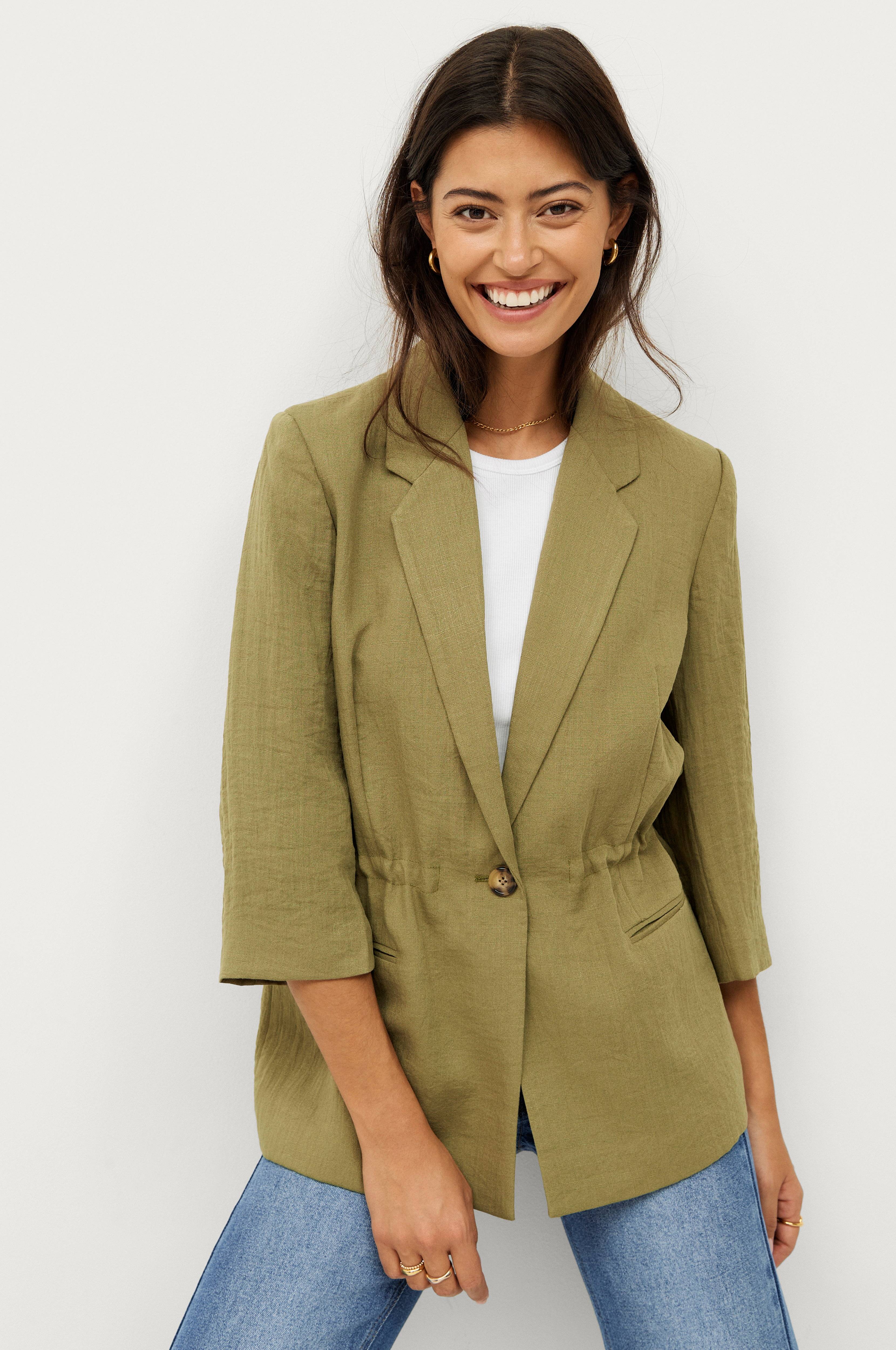 • Bleiseri viskoosisekoitteesta• Sisäinen kiristysnyöri vyötäröllä• Kaksi taskua• Nappi edessä• 3/4-pituiset hihat• Kudottu vuori