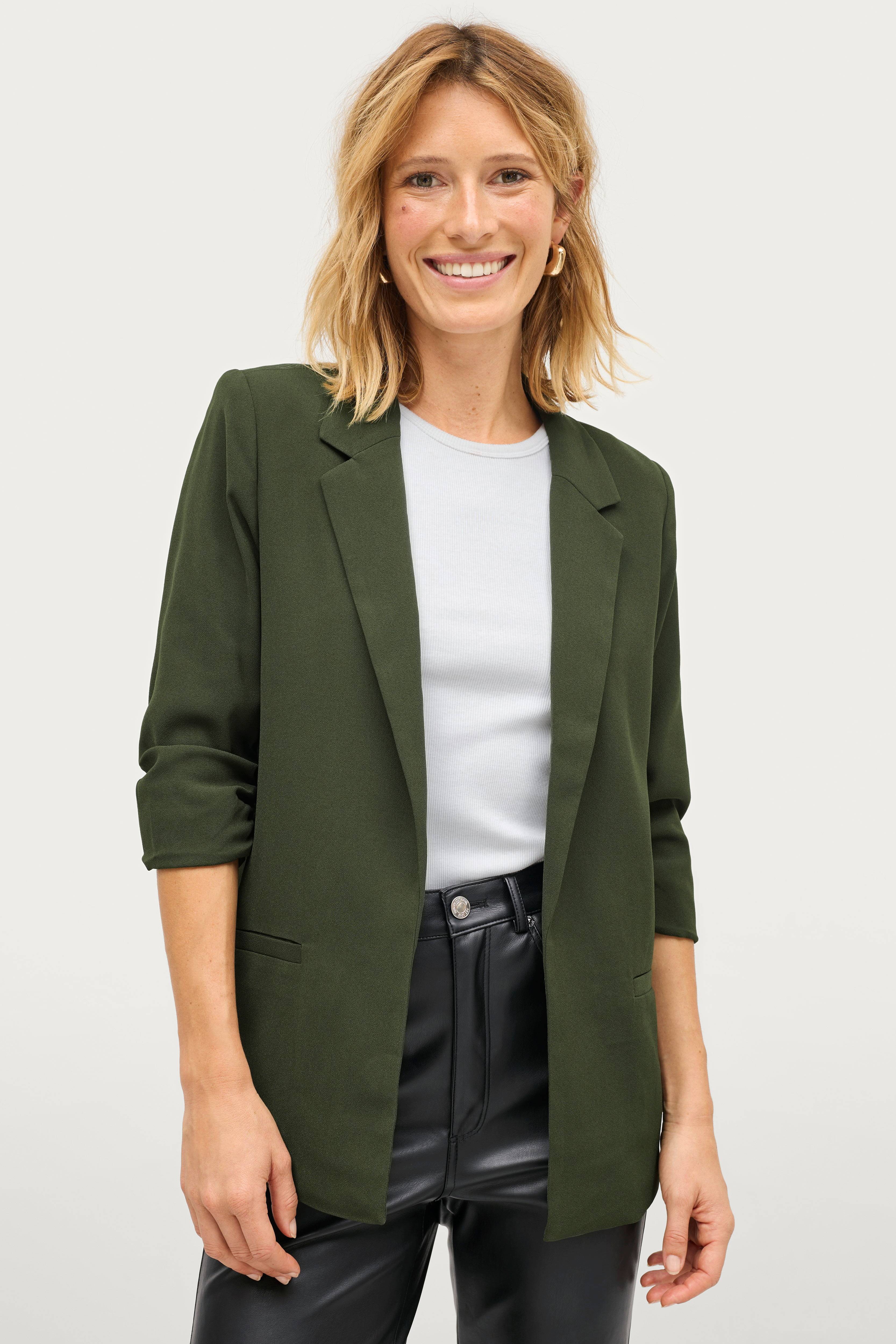 Soaked in Luxury Shirley Blazer -jakku pehmeää materiaalia. Suora, edestä avoin malli. 3/4-pituiset hihat, joissa poimutus hihansuissa. Kaksi etutaskua. Pituus n. 67 cm koossa S.