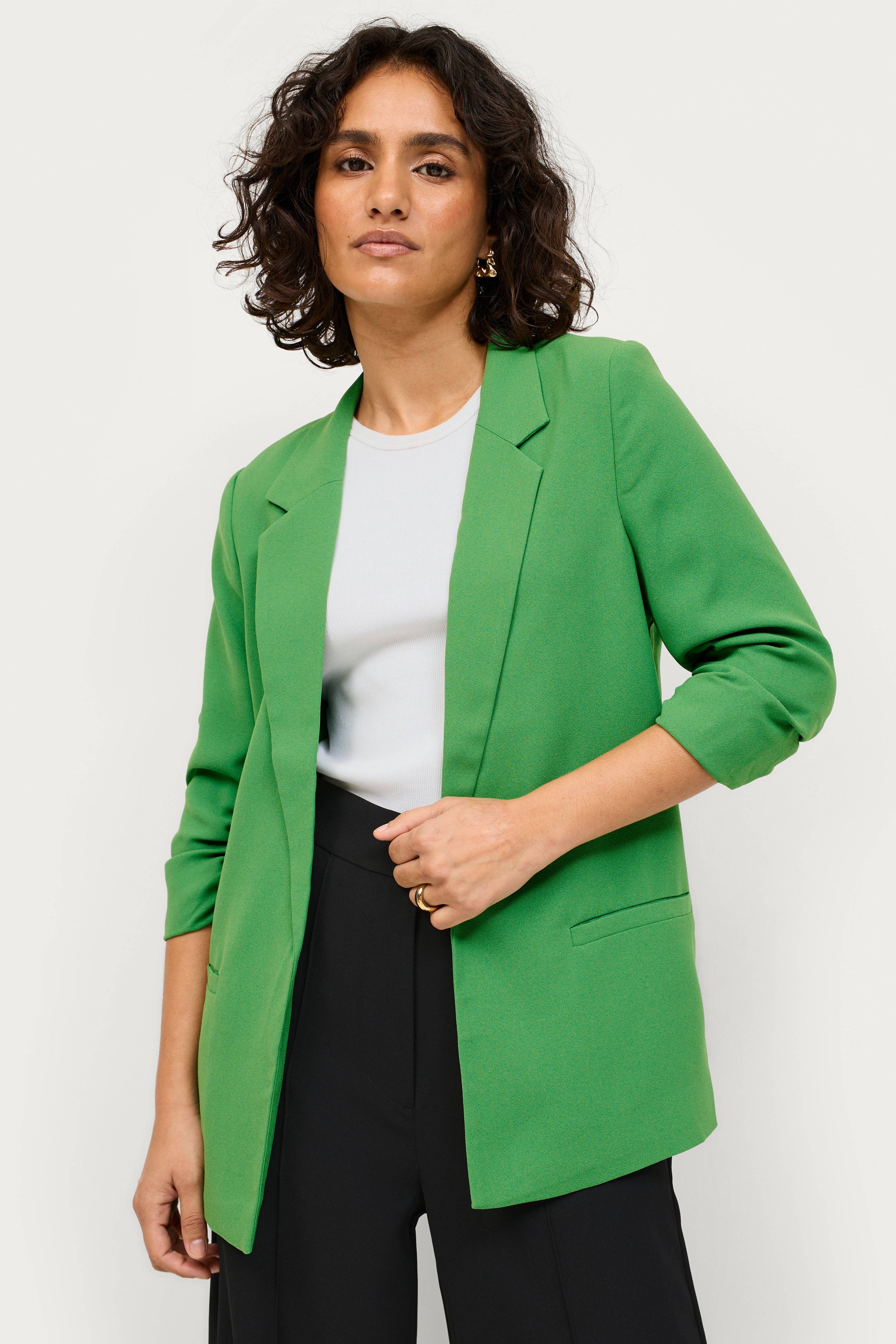 Soaked in Luxury Shirley Blazer -jakku pehmeää materiaalia. Suora, edestä avoin malli. 3/4-pituiset hihat, joissa poimutus hihansuissa. Kaksi etutaskua. Pituus n. 67 cm koossa S.