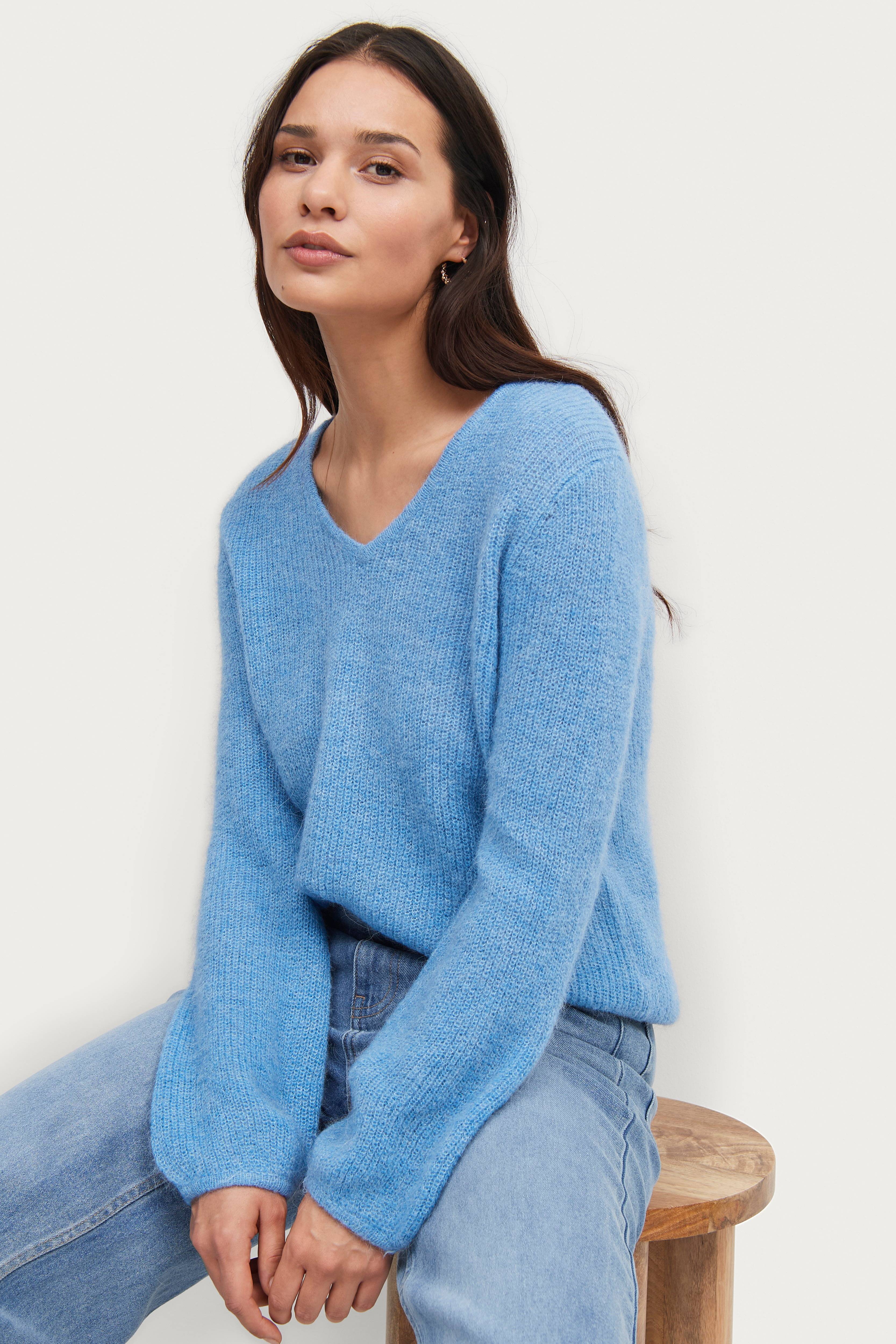 Soaked in Luxury slTuesday V-Neck Jumper LS -neulepusero hieman nukkapintaista villa-alpakkasekoitetta. Suora kapea malli, V-pääntie edessä, väljähköt hihat ja kapeat hihansuut.