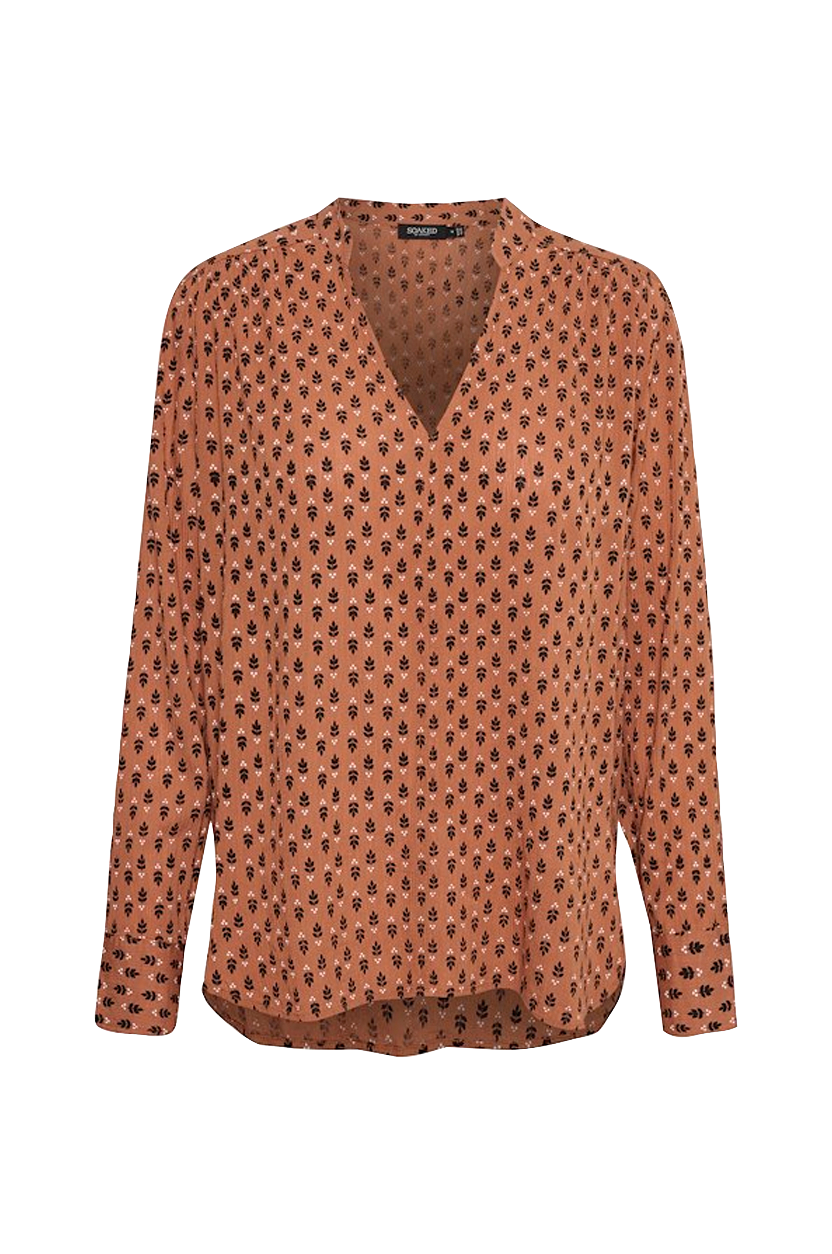 Paita ohutta materiaalia. V-pääntie edessä ja pitkät hihat, joissa kalvosin ja nappi. Poimutetut olkasaumat edessä. Helmassa pyöristetyt sivut ja sivuhalkiot.