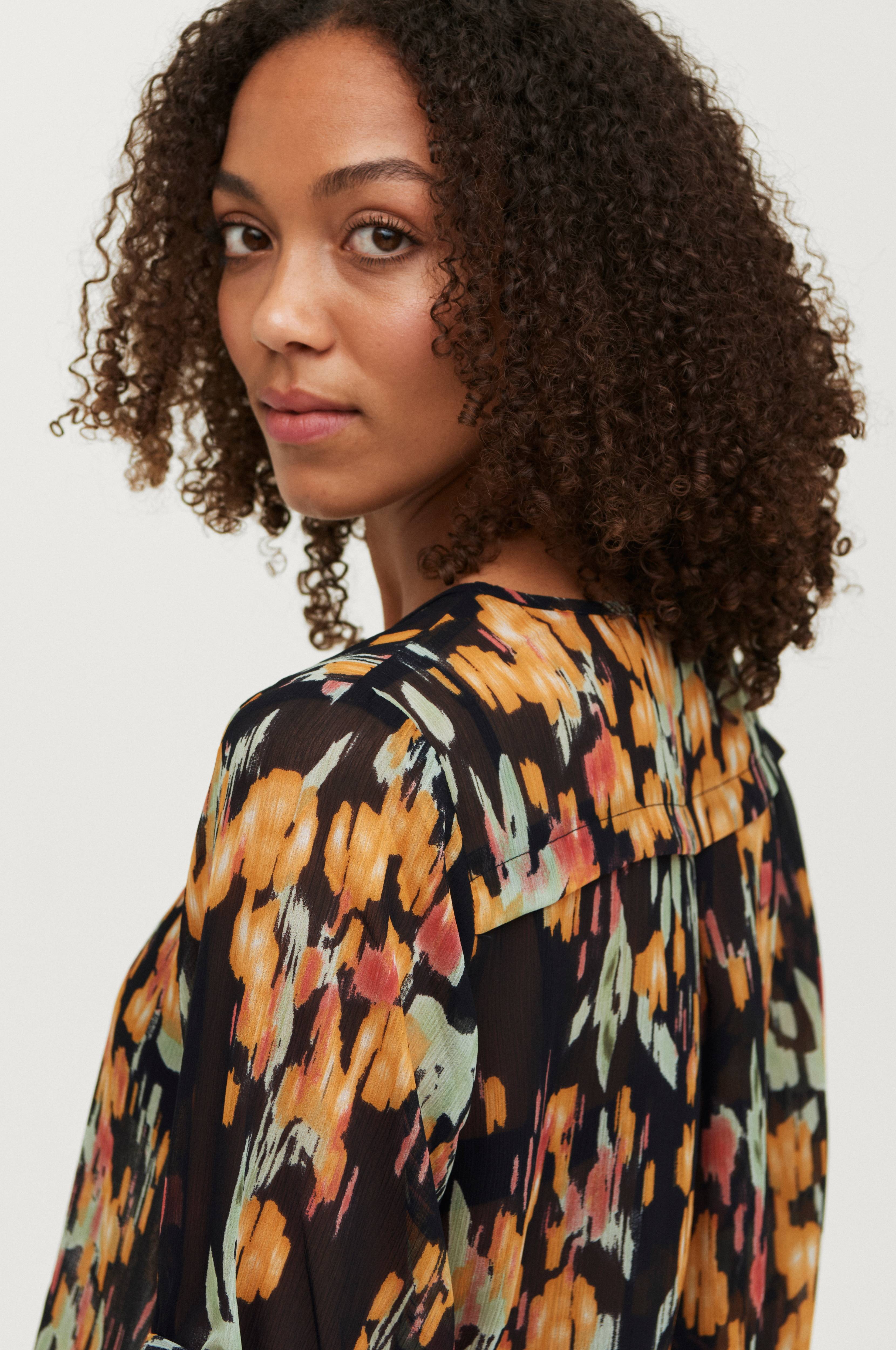 Suora malli kreppisifonkia. Kaarroke, jossa pitkittäinen laskos sekä selässä iso ommeltu vastalaskos. Pyöreä pääntie, jossa kapea reunus, ja lyhyet hihat, joissa kiinniommeltu käänne hihansuissa.
