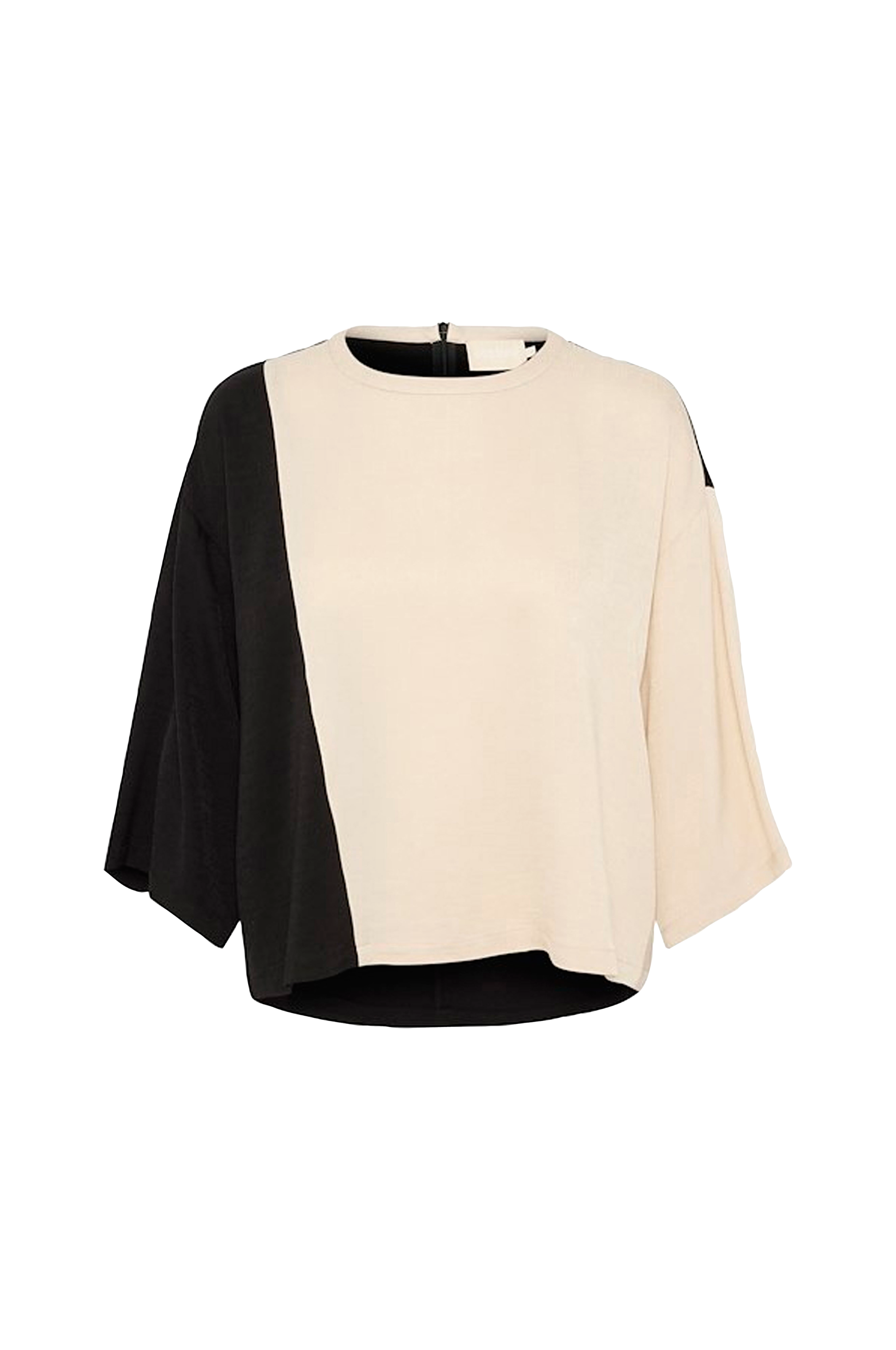 • Pusero kahdesta väristä koostuva pinnoitetusta viskoosista hohdolla• Rento istuvuus• 3/4-pituiset, leveät hihat• Kätketty vetoketju selässä