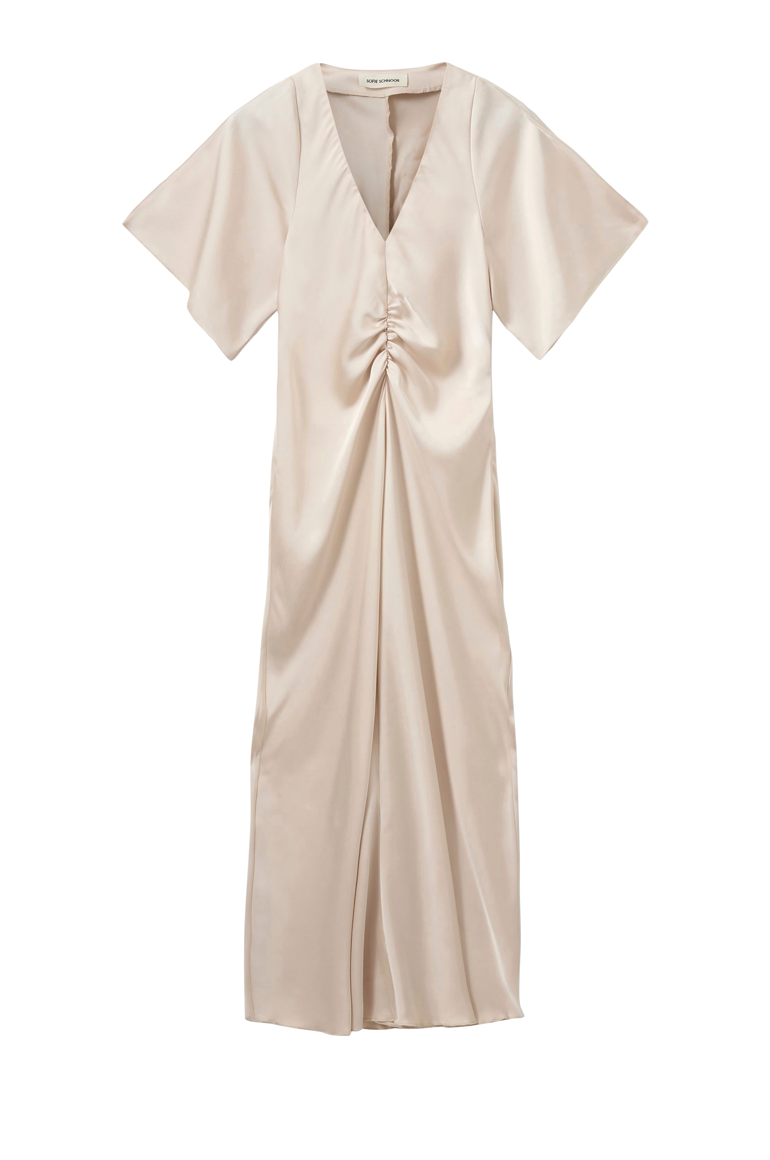 • Tyköistuva, ekstra pitkä malli satiinista• V-muotoinen pääntie• Elastinen drapeeraus rinnassa ja takana• Lyhyt hiha korostetulla saumalla ylhäällä• Pituus: 154 cm koossa 36