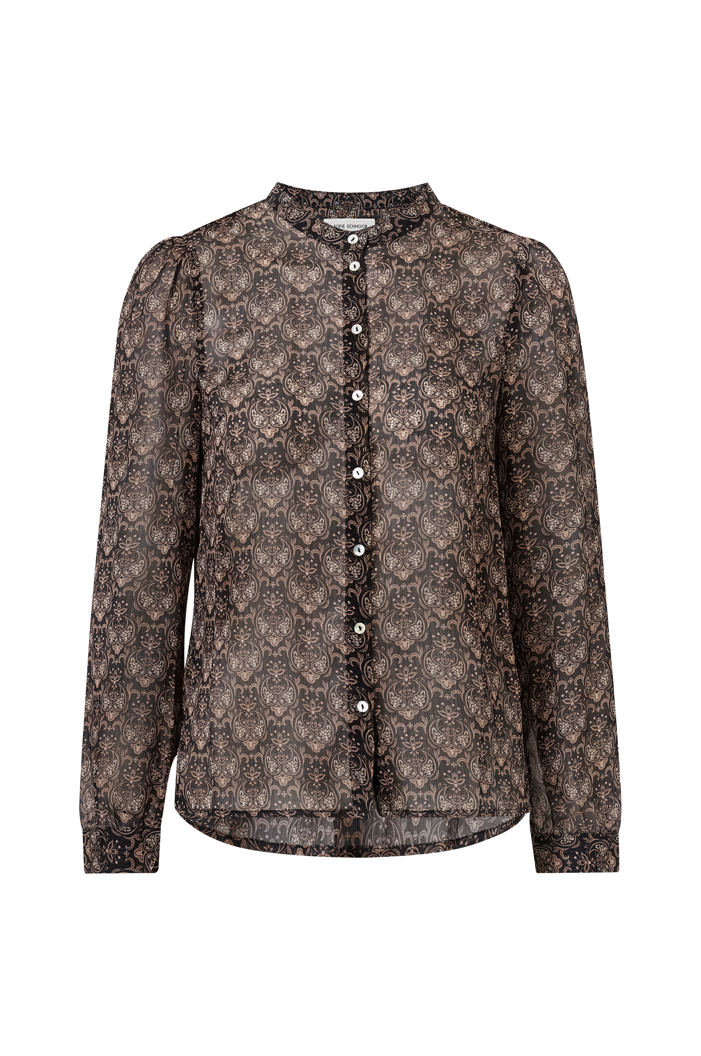 Suora malli sifonkia. Kuviossa aavistus kultaa. Pyöreä pääntie, jossa pieni reunus. Kokopitkä napitus edessä ja leikattu olkakaarroke, jossa ommeltu vastalaskos takana. Puhvihihat, joissa poimutus olkapäillä ja pieni kalvosin hihansuissa.