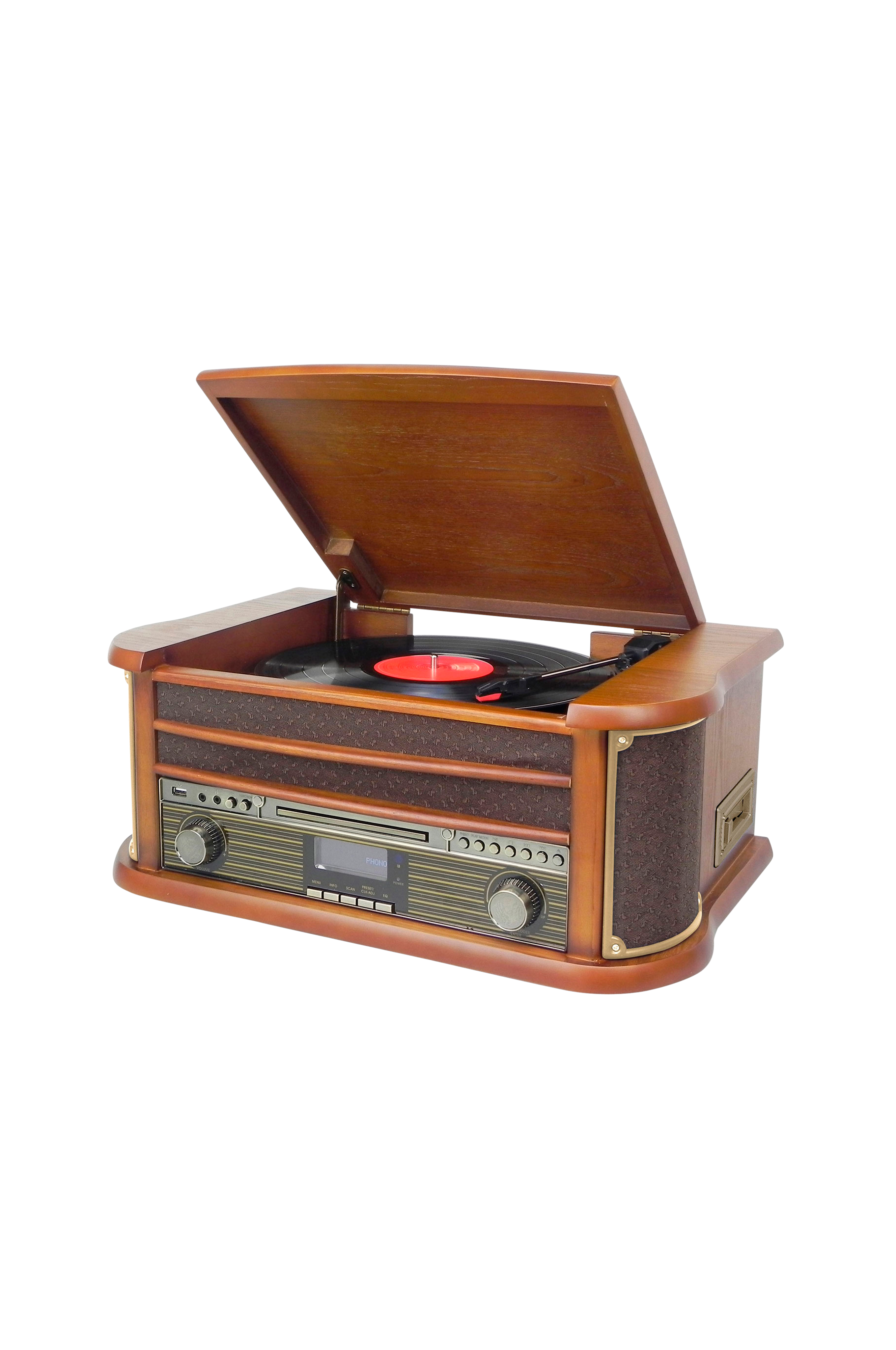 Retrohenkinen musiikkilaite, jossa Bluetooth®, MP3-CD-soitin, levysoitin, kasettisoitin, DAB +/FM-radio sekä tallennus USB-tikulle.