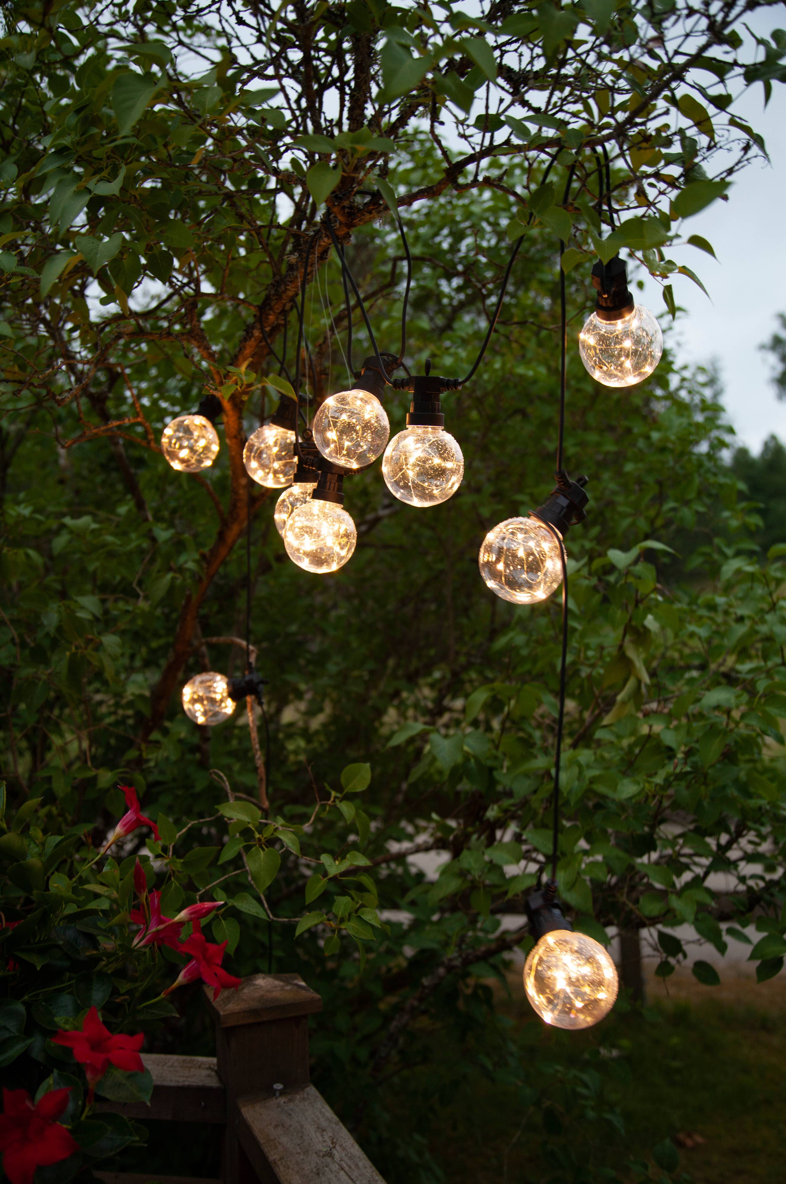 Ripustelin köynnöksen pieneen koristeomenapuuhun. Siellä pallot loistavat kuln taivaasta tulleet tähtiomenat. Valon johto on paksua kumia, joten uskon sen kestävän säänvaihtelut vesisateesta…
