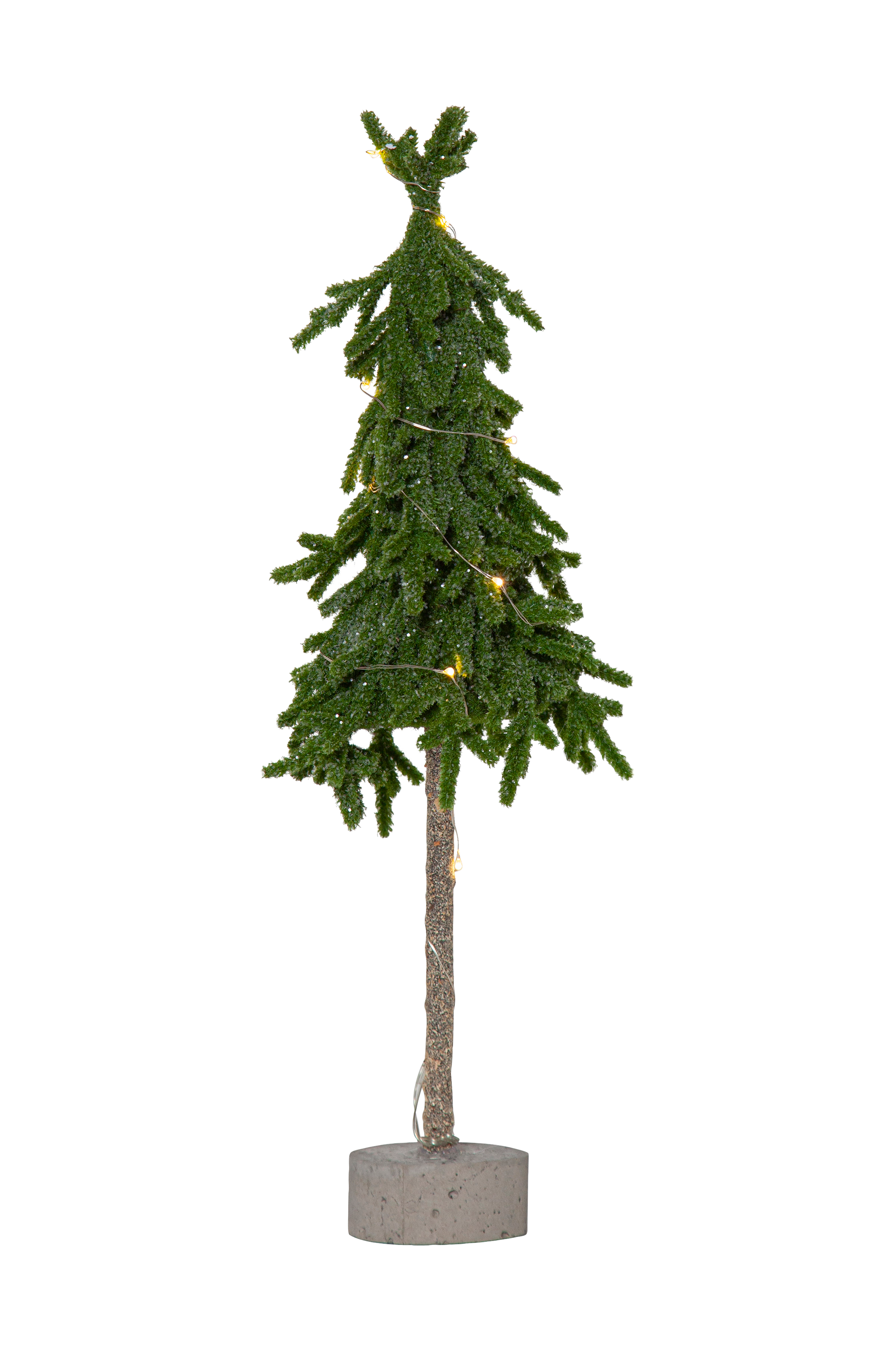 Pöytäkuusi PE-materiaalia. Hieman kimalletta ja jalka sementtiä. 10 pientä lämpimän valkoista dew drops -lamppua. Paristokäyttöinen. Toimii kahdella AA-paristolla. Paristot eivät sisälly toimitukseen. Paloaika n. 200 tuntia.