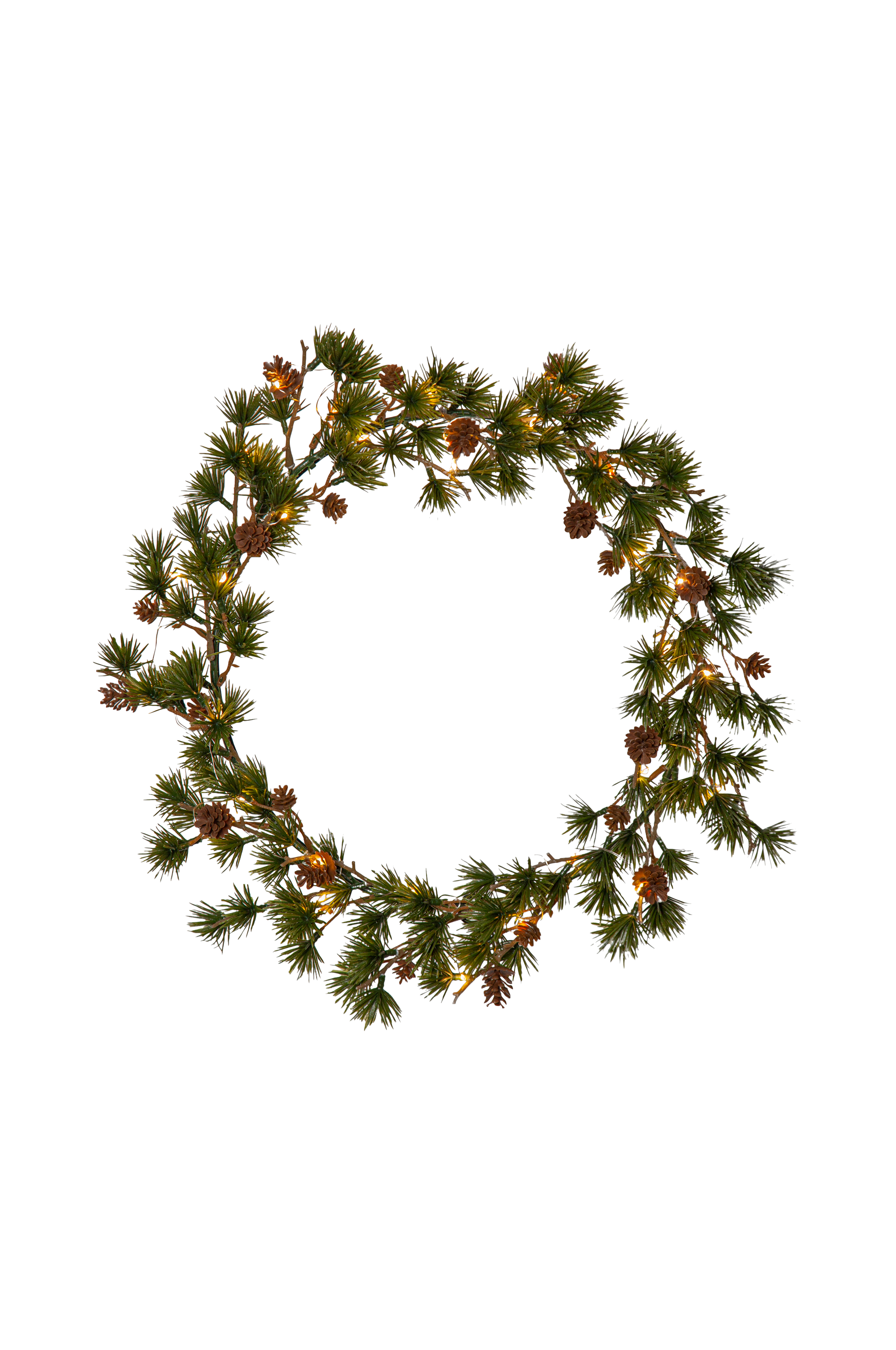 Thuja-kranssin halkaisija on 40 cm. Aidonnäköiset oksat. Oksat on valmistettu PE-materiaalista, mikä on ympäristöystävällinen valinta. 30 lämpimän valkoista valopistettä. Sopii kranssiksi ulko-oveen tai seinäkranssiksi sisälle. Toimii kolmella AA-paristolla. Siinä on ajastintoiminto ja kun kytkin on ajastintilassa, loistaa kranssi kuusi tuntia päivässä noin 25 päivää. Paristot eivät sisälly toimitukseen.