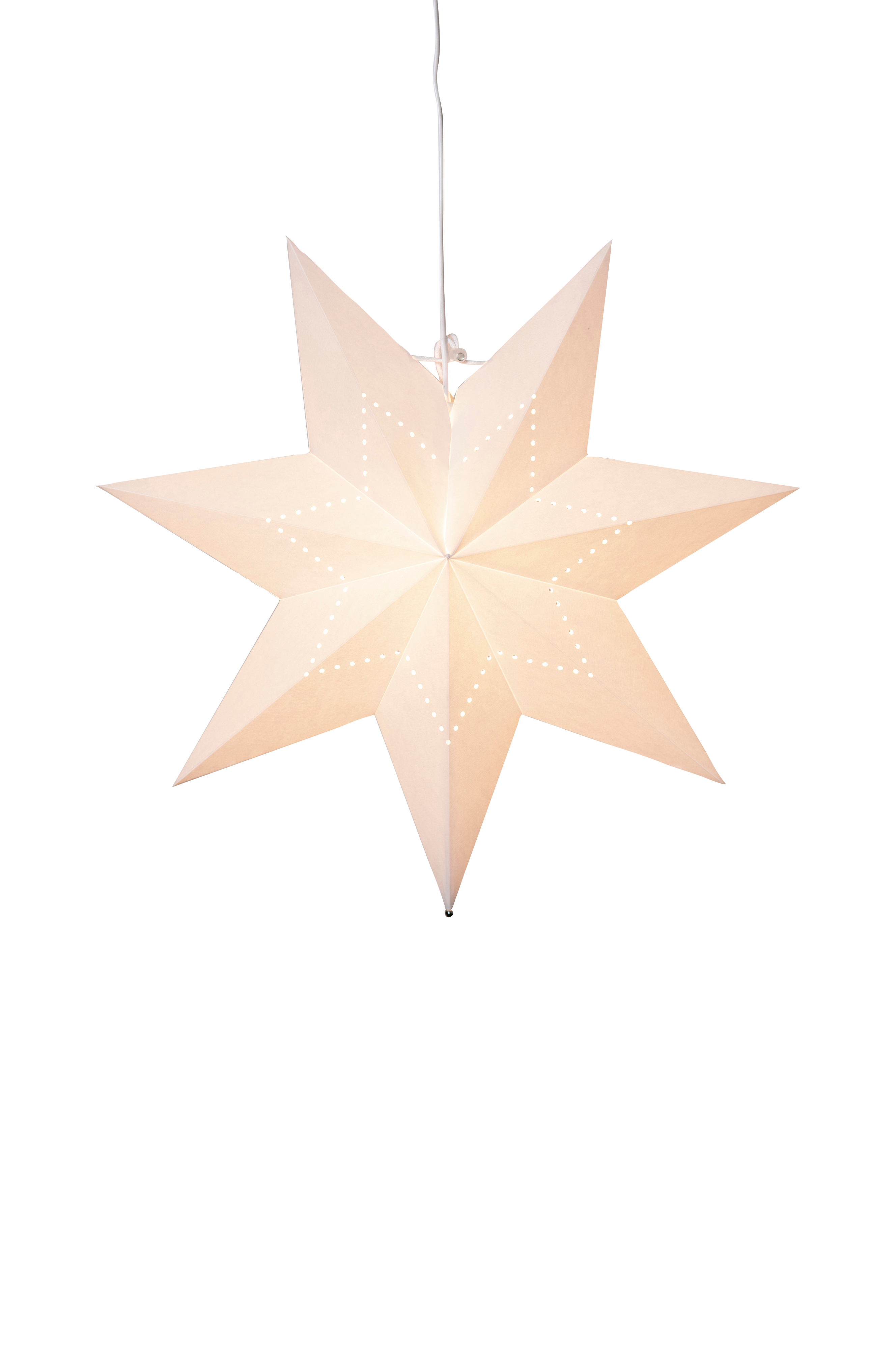 Tähden muotoinen valkoinen paperitähti, jossa reikäkuvio. Sopii hyvin adventti- ja joulukoristeeksi. Ripusta yksi tai monta tähteä yhdessä ikkunaan tai seinää vasten. Tähdessä on paikka yhdelle valonlähteelle. Mukana ripustussarja E14-lampulle.